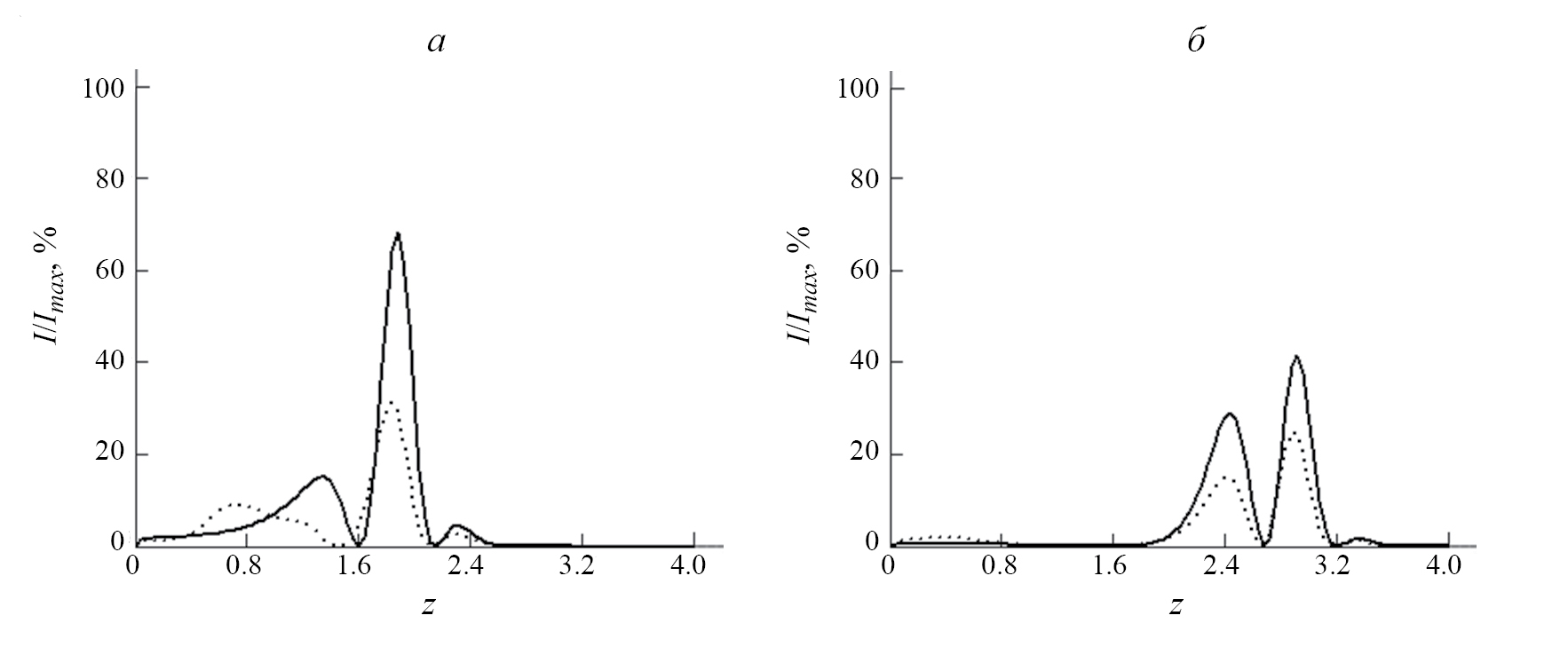 Рис. 3. Продольные срезы интенсивности электрического поля 3D импульса, проходящие через максимум импульса, от координаты z: t = 2.5 (а), 3.5 (б). Сплошная кривая соответствует массиву УНТ без металлической проволоки, точечная — массив УНТ с неоднородностью.