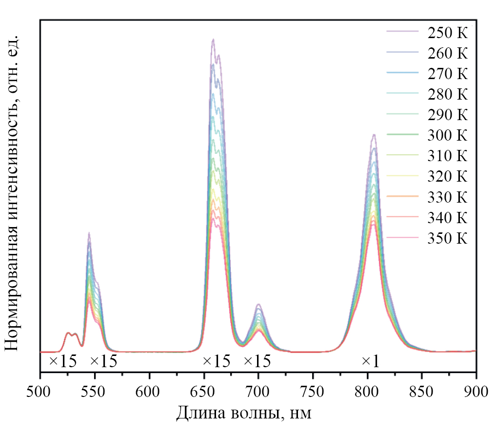 Для исследования температурной чувствительности люминесцентных свойств были измерены спектры эмиссии микрочастиц NaYF4: Yb3+/Er3+/Tm3+ в диапазоне температур 250—350 К. Данные на рис. 3 нормированы на интенсивность полосы 525 нм. Видно, что рост температуры приводит к уменьшению нормированных интенсивностей линий 545, 655, 700 и 805 нм. Эту особенность мы связываем с обеднением населенностей соответствующих уровней из-за увеличения безызлучательной релаксации.