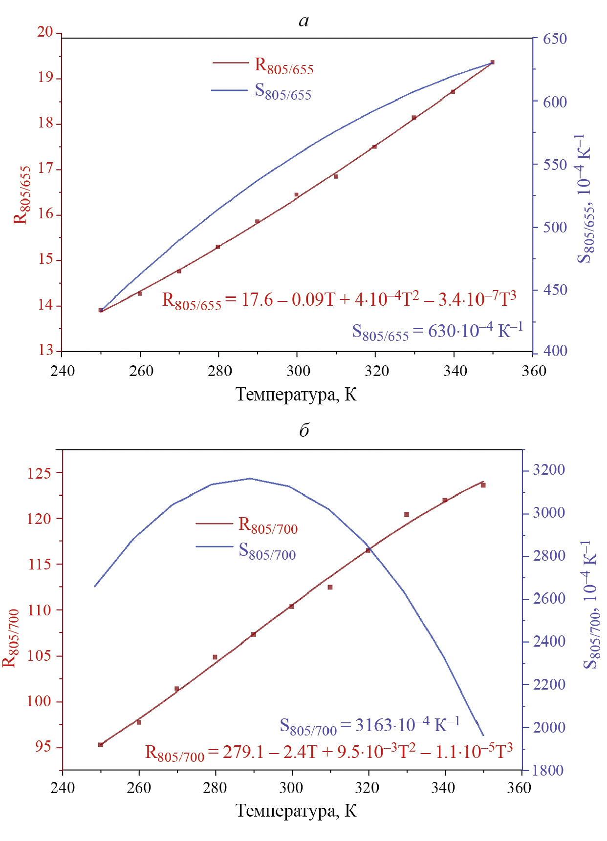 На рис. 5 показаны зависимости R805/655(T) и R805/700(T), вычисленные для полос с максимумами на 805 и 655 нм, 805 и 700 нм, соответственно. Параметры аппроксимирующих кривых представлены в табл. 1. Максимальные значения чувствительностей S805/655 и S805/700 составляют и при температурах 350 и 290 К, соответственно.