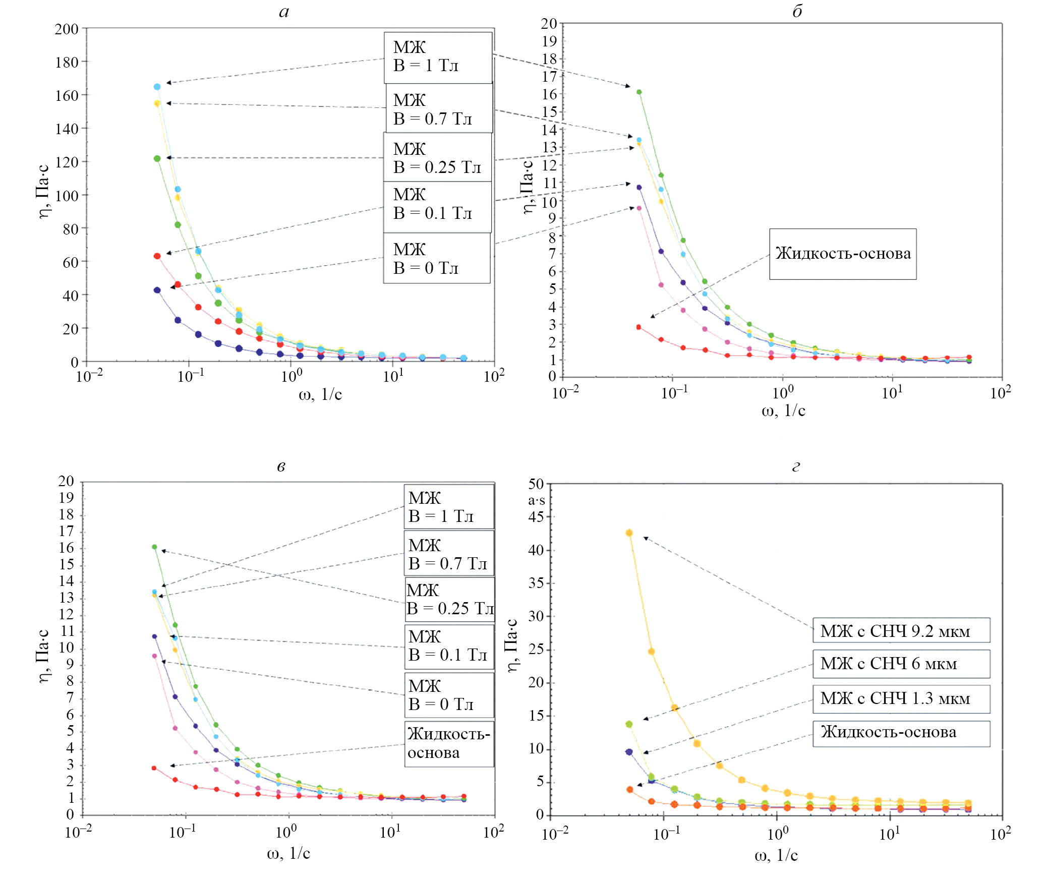При большей концентрации СНЧ растет начальное значение вязкости МЖ, и магнитореологический эффект также более выражен (рис. 3). Для СНЧ длиной 9 мкм наблюдается увеличение вязкости в 2.5 раза по сравнению с начальной вязкостью МЖ и =0 Тл.