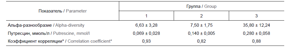Примечание. * — коэффициент корреляции между показателями альфа-разнообразия и количеством путресцина.Note. * — the correlation coefficient between the alpha-diversity index and the amount of putrescine.