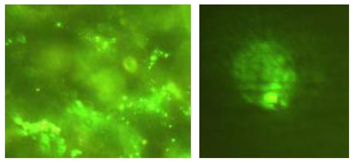Рис. 3. Клетки десневой жидкости, экспрессирующие CD284. Окраска FITC, ×1000.