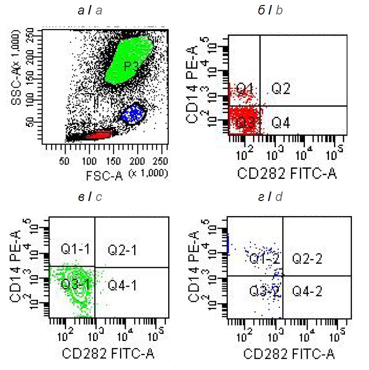 Рис. 4. Экспрессия TLR2 на лейкоцитах периферической крови. Здесь и на рис. 5: а — график переднего и бокового светорассеяния: нейтрофилы — область, окрашенная в зелёный цвет, лимфоциты — участки красного цвета, моноциты — синего цвета; б–г — двумерный точечный график — экспрессия СD14, CD282 и CD14/CD282 на клетках разных популяций лейкоцитов.