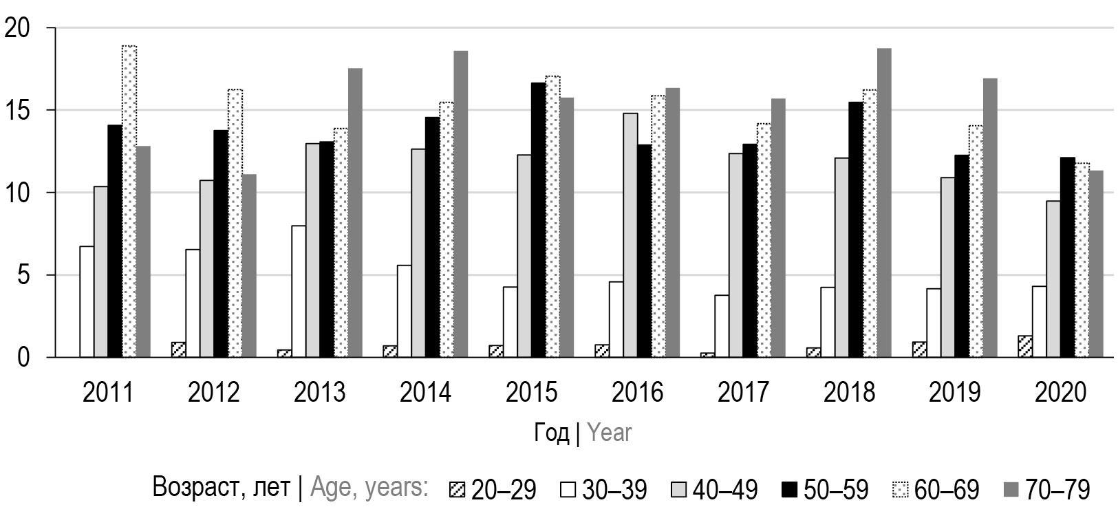 Среди женщин показатели заболеваемости и смертности от рака этой локализации выше, чем у мужчин. Наиболее высокие уровни смертности в изученный период были в возрастных группах 60–69 и 70–79 лет как среди мужского, так и женского населения. Отмечается увеличение показателей смертности в 2016–2020 гг. среди мужчин в возрасте 60–69 лет и женщин 70–79 лет, различия статистически не значимы (р > 0,05).