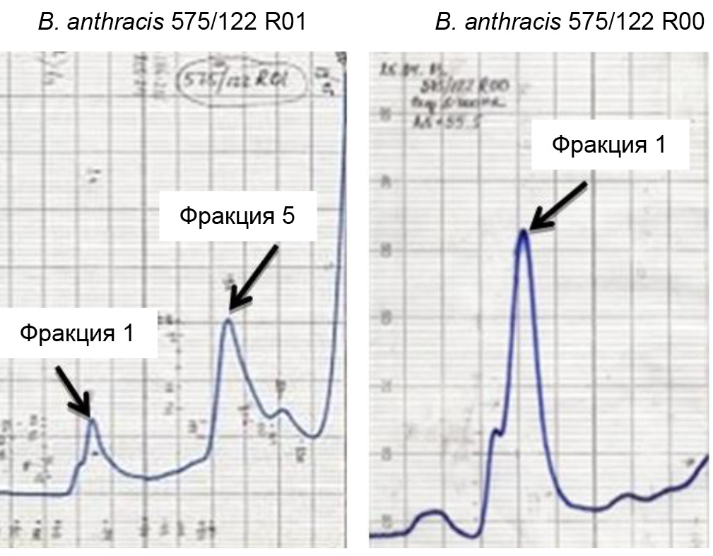В ходе работы получены КФ штаммов B. anthracis 575/122 R01 (рХО1+, рХО2–) с содержанием белка 9,8 мг/мл и B. anthracis 575/122 R00 (рХО1–, рХО2–) с содержанием белка 5,5 мг/мл, проведено их гель-хроматографическое разделение. Хроматограммы изогенных вариантов штамма B. anthracis 575/122 соответствовали хроматограммам КФ штаммов с аналогичным набором плазмид вирулентности, а именно B. anthracis СТИ (рХО1+, рХО2–) и B. anthracis 81/1 R00 (рХО1–, рХО2–) (рис. 1) [6].