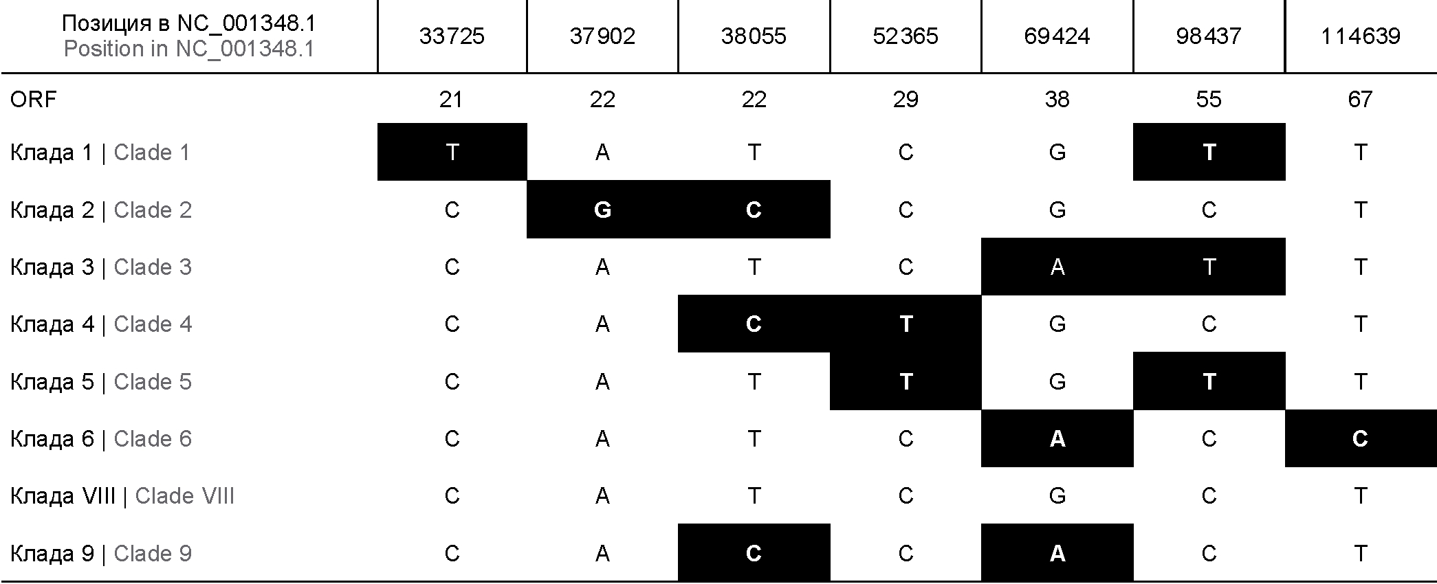 According to the above-mentioned nomenclature of viral clades [19], successful genotyping needs only 7 positions, the combination of variations (single-nucleotide substitutions) in which indicates a particular clade (Table 3). The primers that we constructed (Table 1) are designed to include these variations.
