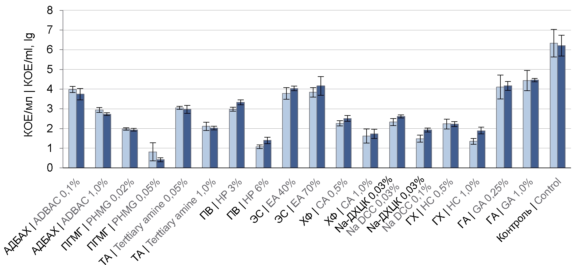 Results. The analyzed bacterial strains formed moderate BFs; the average number of viable cells in BFs was 6.51 ± 0.19 lg. The viable bacterial cell counts in BFs reduced by more than 4 lg when exposed to HP solutions at a concentration of 6%, Na DCC solution — 0.1% (by active chlorine), HC — 1% (by active chlorine), CA – 1% (by product), PHMG — 0.05%, TA — 1.0 %. The BF density decreased by more than 70%. ADBAC solutions at concentrations of 0.1–1.0%, TA — 0.05%, HP — 3%, Na DCC solution — 0.05% (by active chlorine) caused a 2-lg reduction in viable cell counts in BFs. The efficacy of chlorine-active compounds and HP increased when 0.5% sulfonol was added. GA (0.25–1.00%) and EA (40–70%) solutions were ineffective against BF microorganisms.