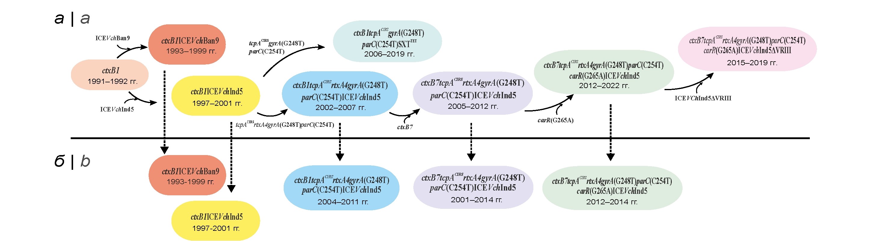 Одно из важнейших событий на следующем этапе микроэволюции — появление геновариантов с новыми аллелями ключевых (tcpACIRS) и дополнительных (rtxA4) генов патогенности, возникших за счёт несинонимичных однонуклеотидных замен в генах tcpA(A266G) и rtxA1(G13602A). Более того, одновременно возникли две точечные мутации в генах gyrA(G248T) и parC(C254T), кодирующих топоизомеразу II (ДНК-гиразу) и топоизомеразу IV, что обеспечило формирование у патогена резистентности к налидиксовой кислоте. Такие геноварианты c генотипом ctxB1tcpACIRSrtxA4gyrA(G248T)parC(С254T)ICEVchInd5, впервые обнаруженные в 2002 г. в Индии, были повсеместно распространены в эндемичных регионах Юго-Восточной Азии в 2002–2007 гг. (рис. 1, а). Тем не менее, наряду с ними, в эндемичных регионах Азии продолжали циркулировать штаммы с интактными генами ctxB1 и rtxA1, но с мутациями в генах tcpA, gyrA, parC. Среди них в Индии (2006–2010 гг.) и Бангладеш (2009–2019 гг.) преобладали штаммы с новым типом SXT — SXTTET, в составе которого были гены tetAR, strAB, sul2 и dfrA1, но, в отличие от других SXT, отсутствовал ген floR. Генотип таких штаммов был обозначен как ctxB1tcpACIRSrtxA1gyrA(G248T)parC(С254T)SXTTET. Вместе с тем распространения таких геновариантов на других территориях не отмечено. Самым существенным изменением генома возбудителя, повлекшим за собой стремительное распространение современных геновариантов, стала мутация в другом ключевом гене патогенности — ctxB1. Однонуклеотидная замена цитозина (С) на аденин (А) в позиции 58 привела к возникновению нового аллеля ctxB7 и появлению ранее неизвестных геновариантов с мутациями в указанных генах патогенности и устойчивости к антибиотикам (генотип ctxB7tcpACIRSrtxA4gyrA(G248T)parC(С254T)ICEVchInd5). Тем не менее их геном продолжал изменяться.