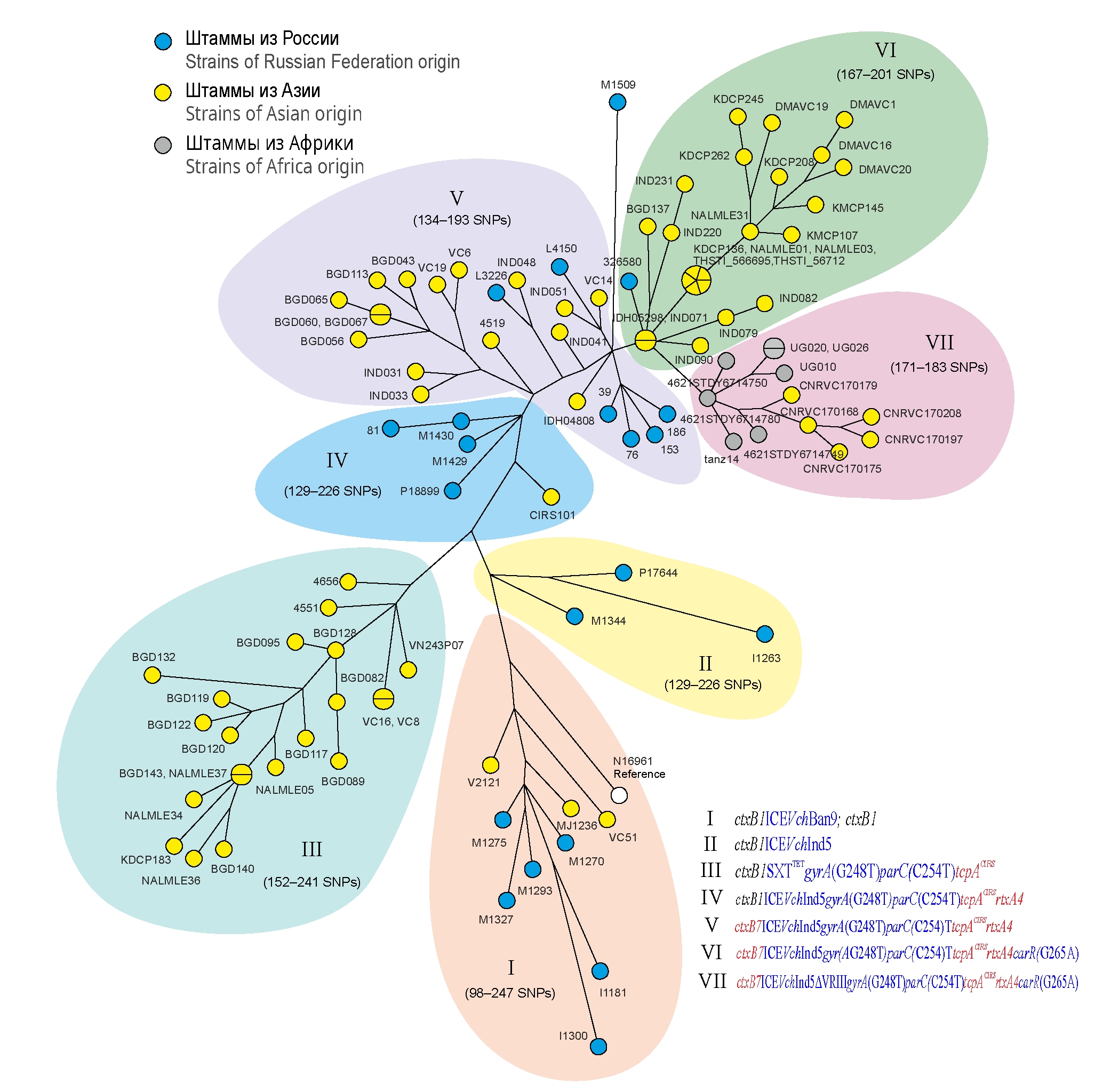 На рис. 2 представлены филогенетические связи 98 штаммов из Азии, Африки и России, установленные на основе их SNP-анализа. При сравнении полных геномов этих штаммов с референсной последовательностью штамма N16961 выявили 1606 SNP в коровых генах. Построенное филогенетическое дерево и его анализ показали, что исследуемые генетические варианты возбудителя образуют 7 кластеров, в каждый из которых входили штаммы с определённым генотипом (рис. 2). Так, кластеры I и II состояли из геновариантов, изолированных в начальный период их образования (1993–1998 и 1997–2001 гг. cоответственно) и различающихся присутствием в геноме разных типов SXT-элемента. Последующие поэтапные изменения генома возбудителя в процессе эволюции привели к формированию различных групп геноварианов, различающихся новыми мутациями генов патогенности и лекарственной устойчивости и вошедших в состав других 5 кластеров (III–VII), что отражает их геномное разнообразие. Наиболее удалённые от референсного штамма кластеры VI и VII образовали геноварианты, возникшие в последнее десятилетие и несущие сочетание последних наиболее существенных изменений в геноме (ctxB7, carR(C254T) и ctxB7, carR(C254T), ICEVchInd5ΔVRIII) с ранее возникшими мутациями в генах tcpA, rtxA1, gyrA и parС (рис. 2). Тем не менее, несмотря на геномное разнообразие, представленные варианты возбудителя, изолированные в разных эндемичных и неэндемичных регионах, филогенетически связаны друг с другом. Следует особо отметить тесную филогенетическую связь геновариантов из России c изолятами из эндемичных стран Юго-Восточной Азии. В частности, такая связь была выявлена между геновариантами, завезёнными в Россию в 2004–2014 гг., и штаммами, циркулирующими в Индии в тот же период.