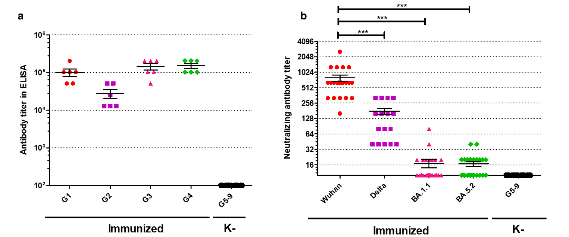 Fig. 2. Immunogenicity of the D-D2 strain in hamsters following single intranasal administration. Hamsters of G1–G4 groups were immunized with the D-D2 strain. a — titer of IgG antibody to SARS-CoV-2 proteins by ELISA; b — titers of neutralizing antibodies against different SARS-CoV-2 strains in the sera of all animals from groups G1–G4 (n = 24) — Dubrovka (Wuhan), Podolsk (Delta), Otradnoe (BA.1.1), and FEB2 (BA.5.2). The limit of detection was 20. ***p < 0.001.