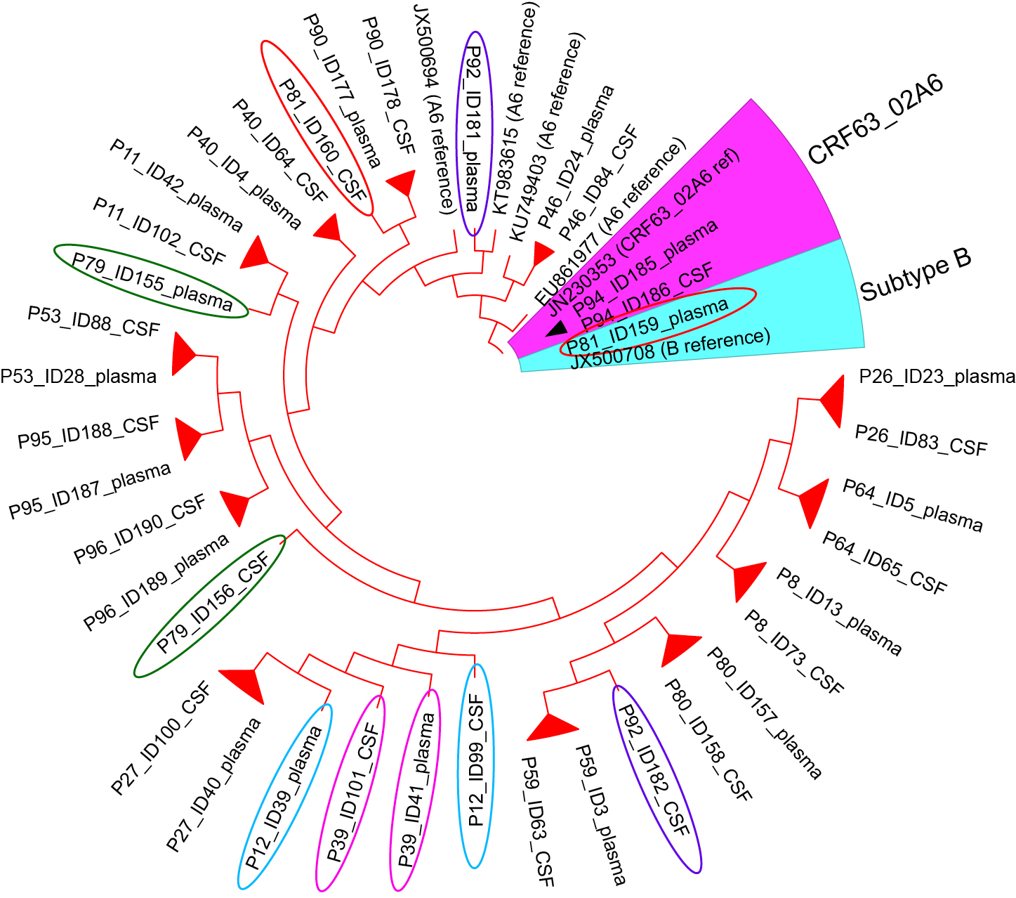 Fig. 4. Phylogenetic tree of 38 HIV-1 pol gene sequences from 19 patients obtained in pairs from blood plasma and CSF. Ovals of the same color indicate paired samples that have fallen into different clusters. Red branches and clusters contain HIV-1 subtype A6 sequences.