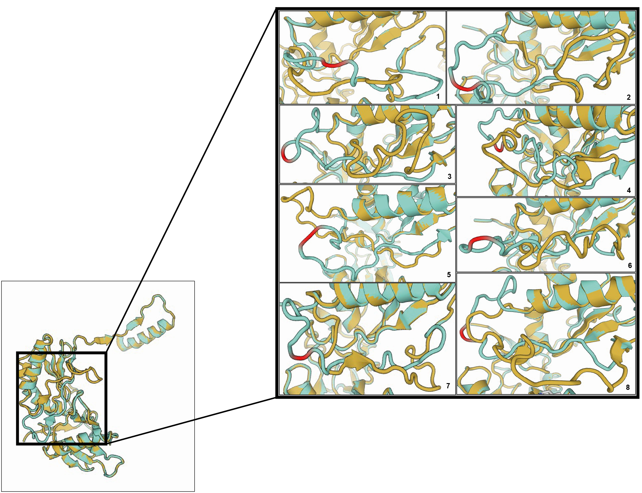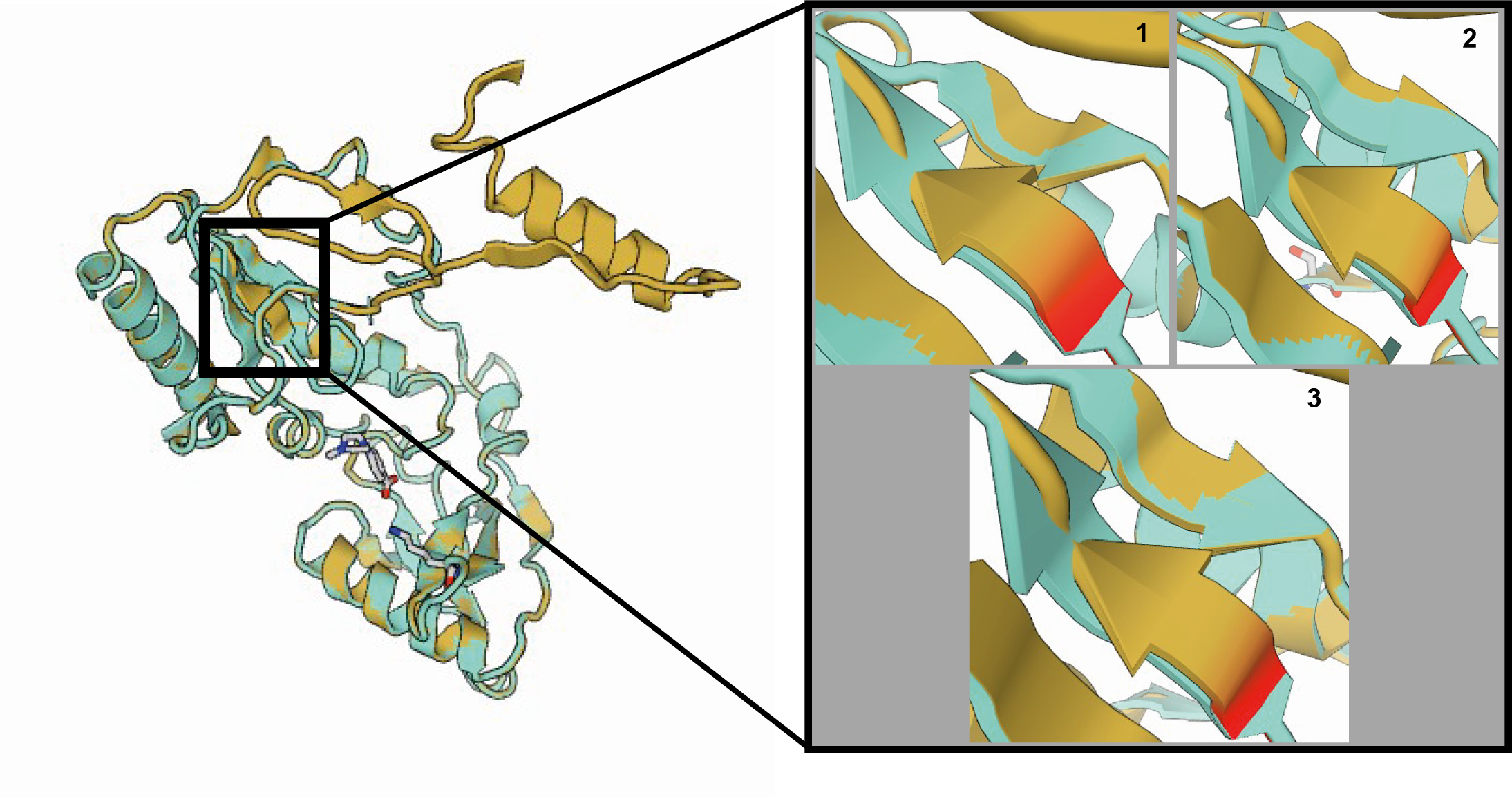 Fig. 5. Difference in the tertiary structure of HIV-1 reverse transcriptase p51 subunit between strains from blood plasma and from CSF. Amino acid positions 16–20 are framed. Strain from blood plasma is shown in cyan, from CSF — in light brown. Amino acid position 18 is highlighted in red.