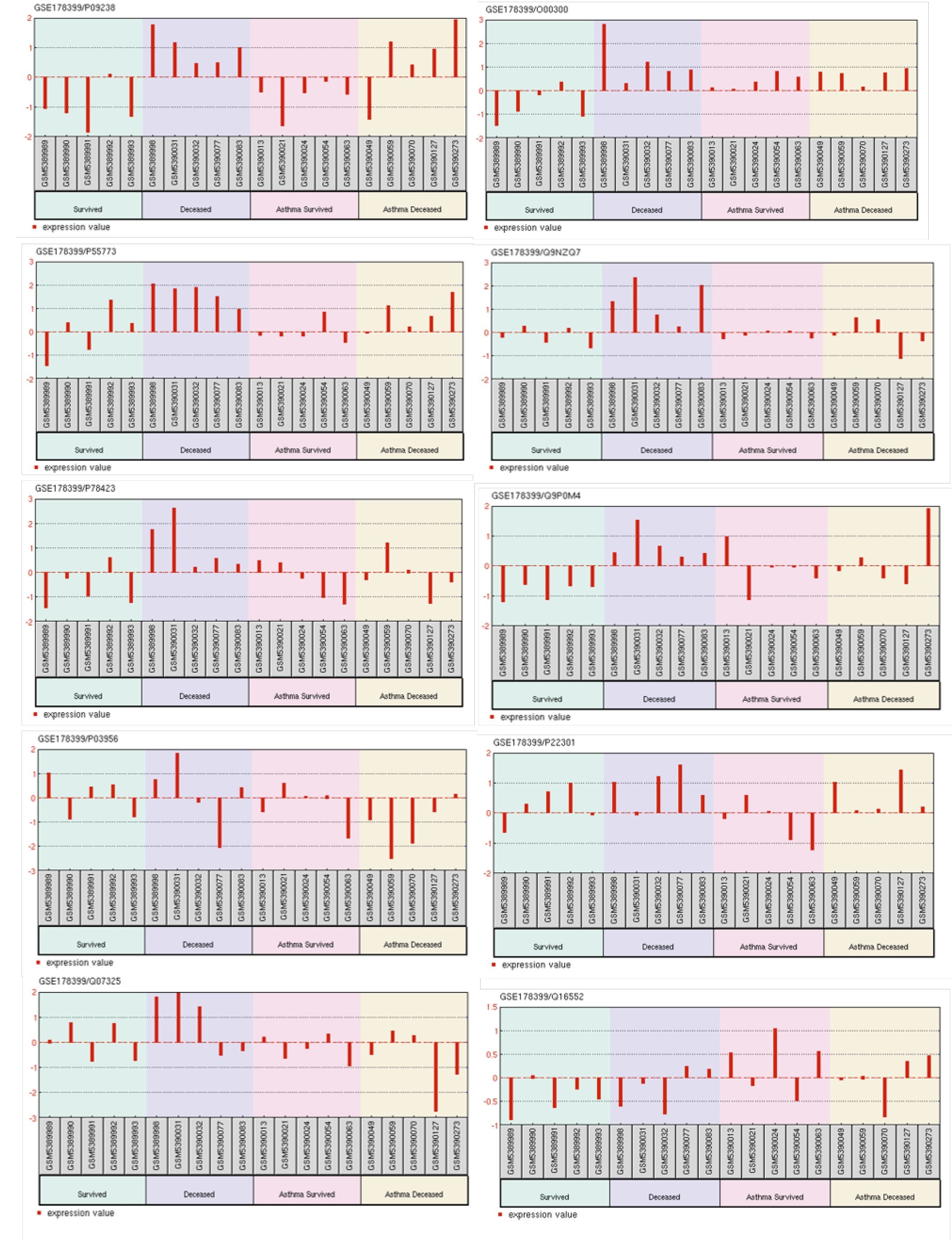 Results. MMP10 (Matrix metalloproteinase-10), TNFRSF11B (Tumor necrosis factor receptor superfamily member 11B), CCL23 (C-C motif chemokine ligand 23), CD274 (Programmed cell death 1) CX3CL1 (C-X3-C motif chemokine), and IL17C (Interleukin-17C) had down-regulation for all patients. Transcriptome data conducted no correlation between the expression of MMP10 and asthma, although there is a significant correlation between the expression of MMP1 and sensitivity. The expression of IL17A, which is strongly related to allergic asthma, is decreased in non-asthmatic individuals but elevated in asthmatic patients, notably in survivors. Patients who were not asthmatic had significantly higher CXCL9 levels.