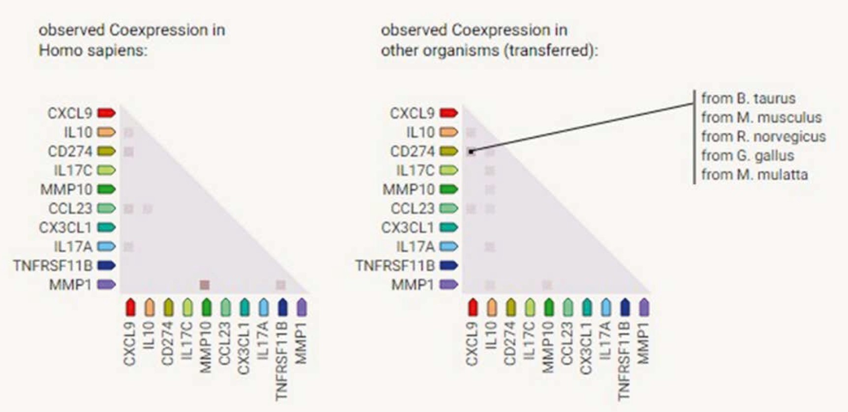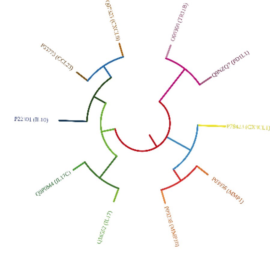 According to the criterion of P < 0.05, ten genes (MMP10, TNFRSF11B, CCL23, CD274, CX3CL1, IL17C, MMP1, IL10, CXCL9, and IL17A) were identified as being associated with an increased risk and warranting further investigation. Heat maps illustrating the relationship between these shared genes based on sample expression revealed that a large proportion of the genes with down-regulated expression were shared (Fig. 5). The type and strength of the relationship between the 10 immune genes are depicted in Fig. 6, a. Seven of ten genes were shown to have a distinct cumulative association after clustering, as shown in Fig. 6, b. Proteins whose gene expression is associated across a wide range of tests. Figure 7 illustrates coexpression scores based on protein co-regulation and RNA expression patterns. Proteins that coexpress the 10 genes under study are associated in a way that is distinct from that seen in other organisms. Figure 8 depicts a phylogenetic tree of the 10 immune-correlated immune genes. Clade Coverage for collapsed groupings of genomes in the phylogenetic tree shows the lowest and highest similarity within that clade as two different hues. Each gene of interest has a color corresponding to the similarity of its best hit inside a specific STRING genome. Interactions can be predicted based on the correlations between these presence/absence profiles. Gene co-occurrence of the correlated gene families with comparable occurrence patterns across genomes is shown in Fig. 9.