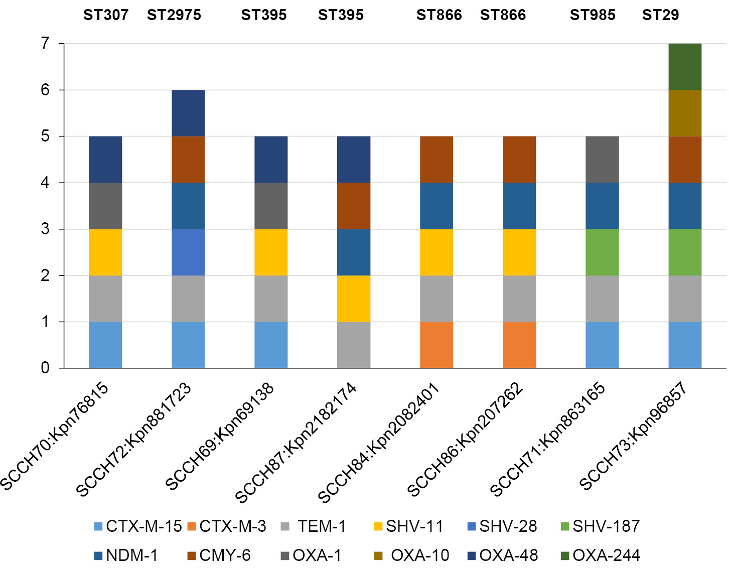Fig. 1. Diversity of beta-lactamase genes in the genomes of the studied isolates.