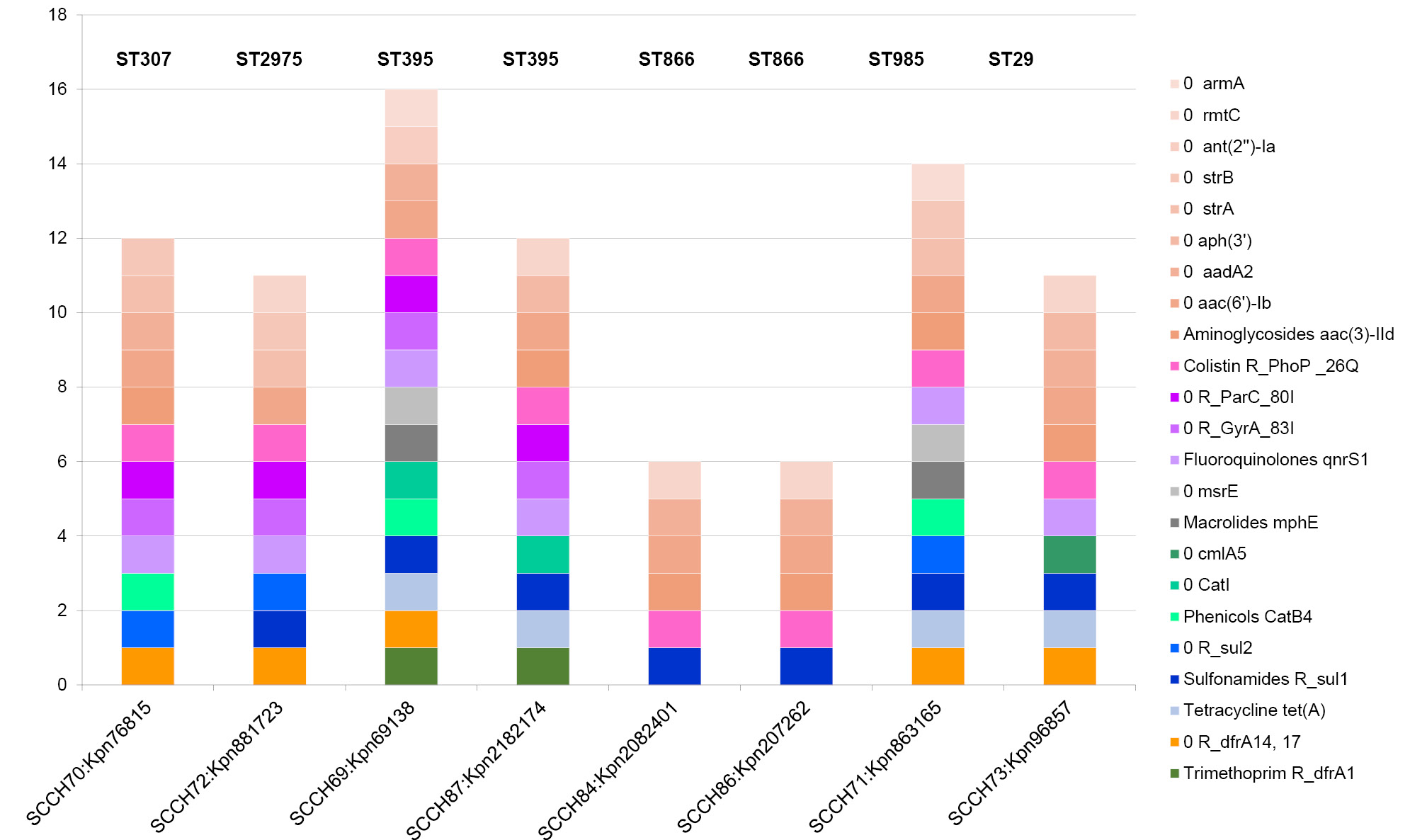 Гены резистентности иных категорий антибиотиков представлены на рис. 2. У изолятов ST866 выявили минимальное количество дополнительных генов резистентности — 6. Среди них отсутствуют гены устойчивости к фторхинолонам и триметоприму, что подтверждает фенотипические данные. Максимальное количество дополнительных генов у изолята ST395 P8 — 16. У него и у изолята ST985 (14 генов) для каждой категории антибиотиков есть хотя бы один ген, определяющий устойчивость. Отметим, что только у изолятов-лидеров есть гены устойчивости к макролидам.