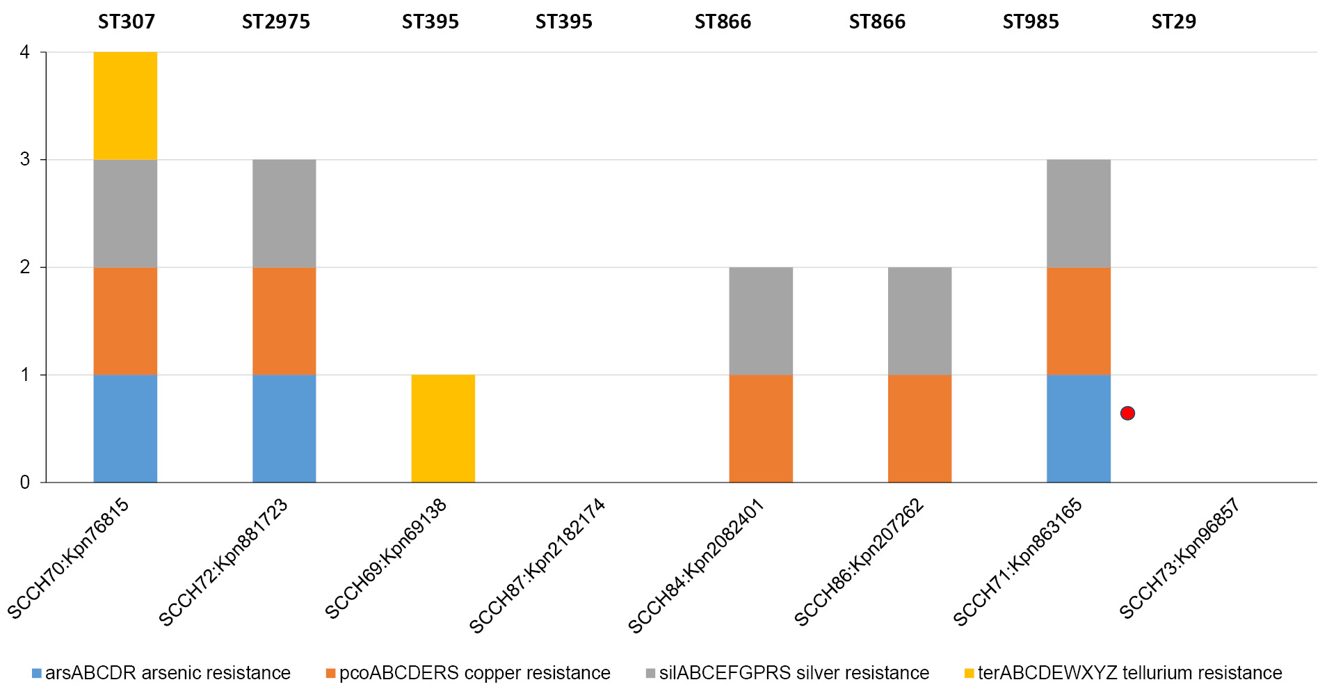 Гены устойчивости к ионам тяжёлых металлов обнаружены в 6 из 8 геномов (рис. 3). Это опероны устойчивости к мышьяку (arsABCDR), меди (pcoABCDERS), серебру (silABCEFGPRS) и теллуру (terABCDEWXYZ). Все 4 оперона присутствуют в геноме ST307, по 3 — в геномах ST2975 и ST985, по 2 — в ST866, а в геноме ST395 P8 — только оперон устойчивости к теллуру.