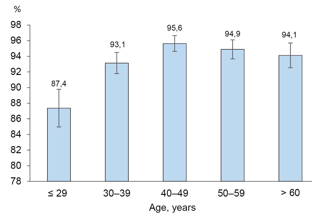 Screening for antibodies to VZV in medical workers of a multidisciplinary hospital revealed a high proportion of seropositive individuals (93.7%). Taking into account that the study involved individuals of a certain vulnerable population group (employees of the HCO), we did not extrapolate the results of the screening to the adult population of the country. At the same time, the obtained result is comparable with the data of population studies on assessment of immunity to VZV in European countries, indicating that more than 90% of adults in most of them are VZV seropositive. At the same time, the level of adult seropositivity is higher than in most Asian countries with warmer climates (India — 68.2%, Turkey — 77.8%, Thailand — 61.4%, Iran — 78.5%, etc.) [16].