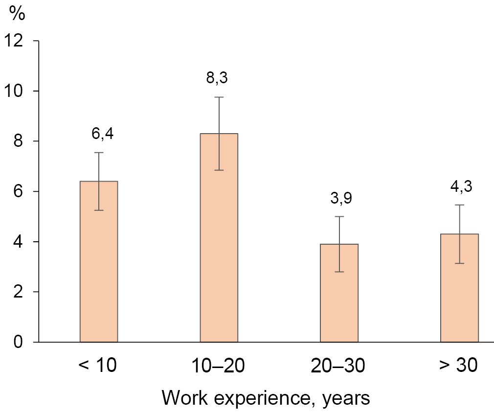 Work experience, years | < 10 | 454 | 29,3 |