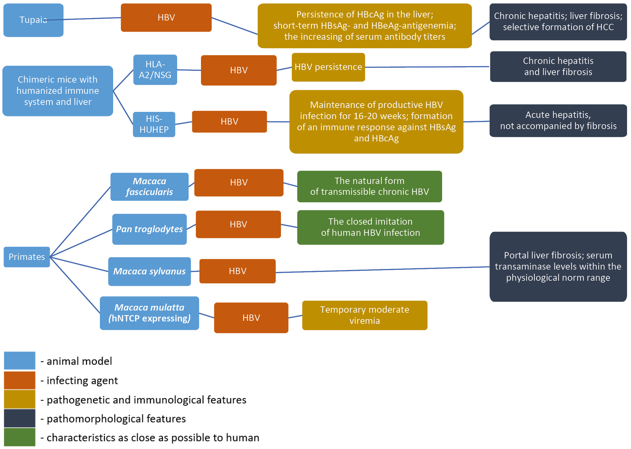 To complete this review, we analyzed the information about the features of HBV infection models in vivo, published over the last 25 years in open sources (Web of Science, PubMed, Scopus, ScienceDirect, Springer). The main criteria for literature selection were the type of infecting agent, the observed immunologic features of the course of the infectious process and the availability of a description of the pathomorphological features in model organisms.