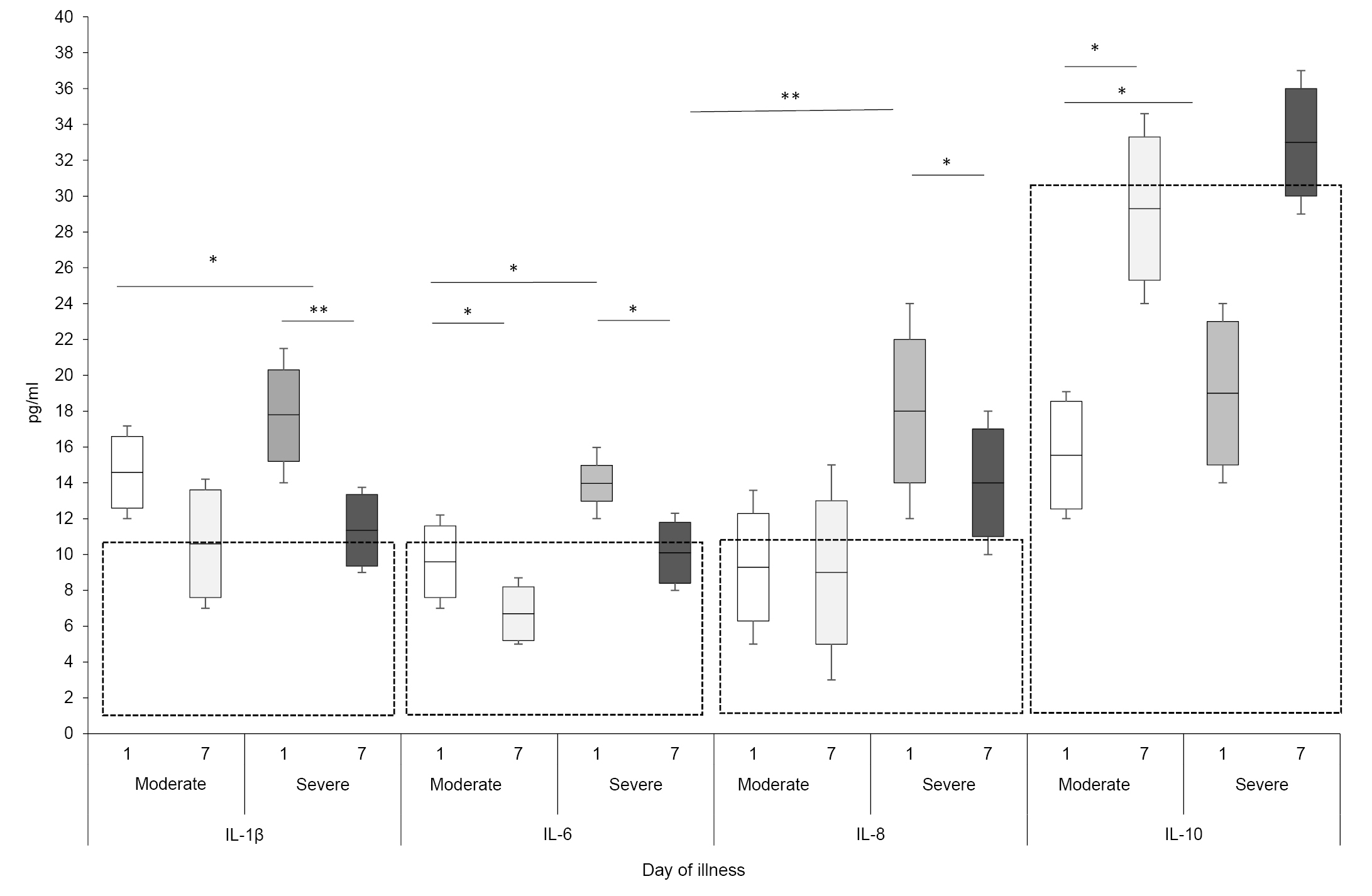 The study of cytokine status showed that the level of interferon-γ and tumor necrosis factor-α were within the reference values and did not differ significantly in patients with different degrees of campylobacteriosis severity. The most significant results were obtained when analyzing the pro-inflammatory cytokines IL-1β, -6, -8 and regulatory IL-10 (Fig. 1).