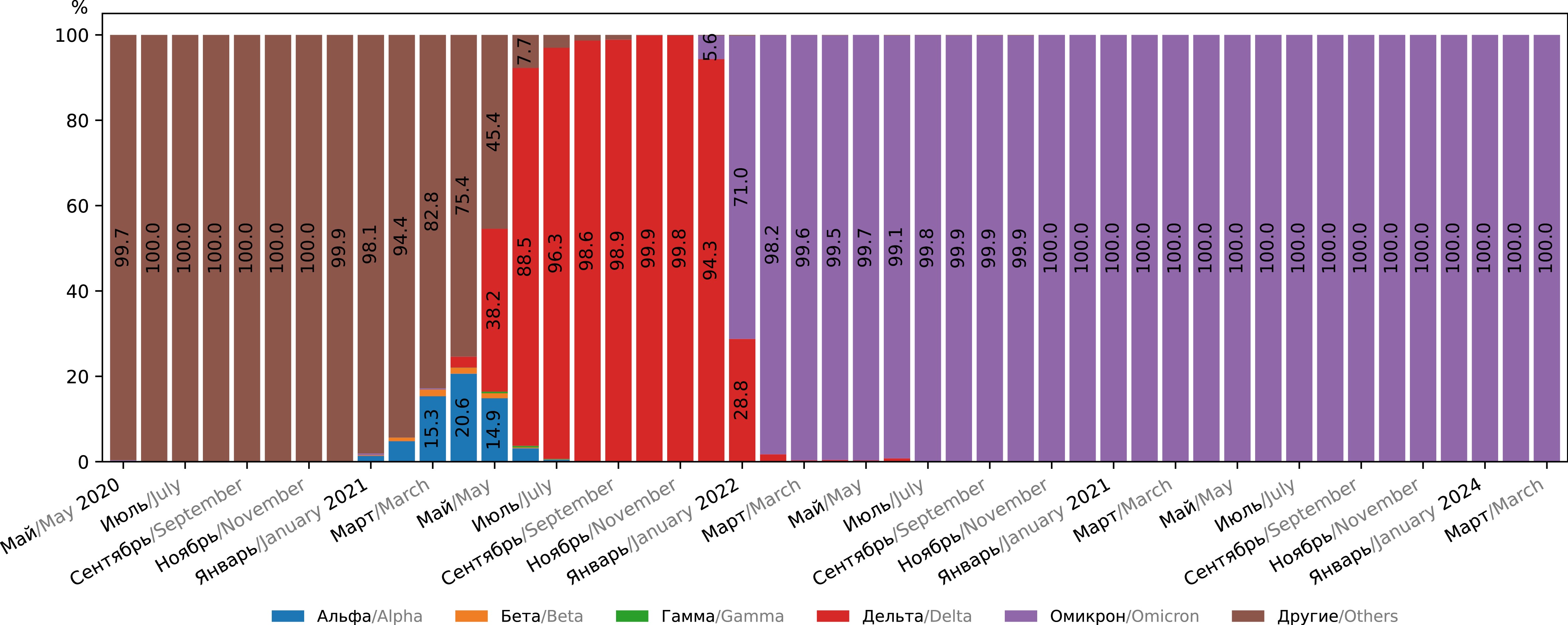 Рис. 2. Диаграмма частот встречаемости значимых вариантов SARS-CoV-2 в России с мая 2020 г. по март 2024 г.