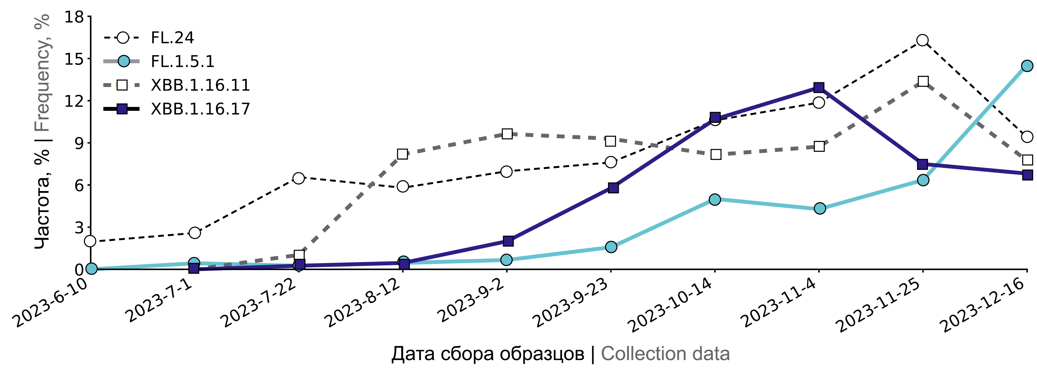 Изучение динамики распространения этих линий со временем может потенциально помочь прогнозировать эволюцию SARS-CoV-2. По этой причине динамика частоты для нескольких обсуждаемых сублиний с июня по декабрь 2023 г. представлена на рис. 6. Линии XBB.1.9.1 и XBB.1.16 были намеренно исключены из этого анализа в силу убывающего или статичного характера тренда их частот в рассматриваемый период. Первая линия значительно снизила свою распространённость почти до нуля, в то время как вторая не изменила существенно свою частоту, оставаясь в пределах 6–16%. Следовательно, они не рассматриваются как будущие потенциально доминирующие линии.
