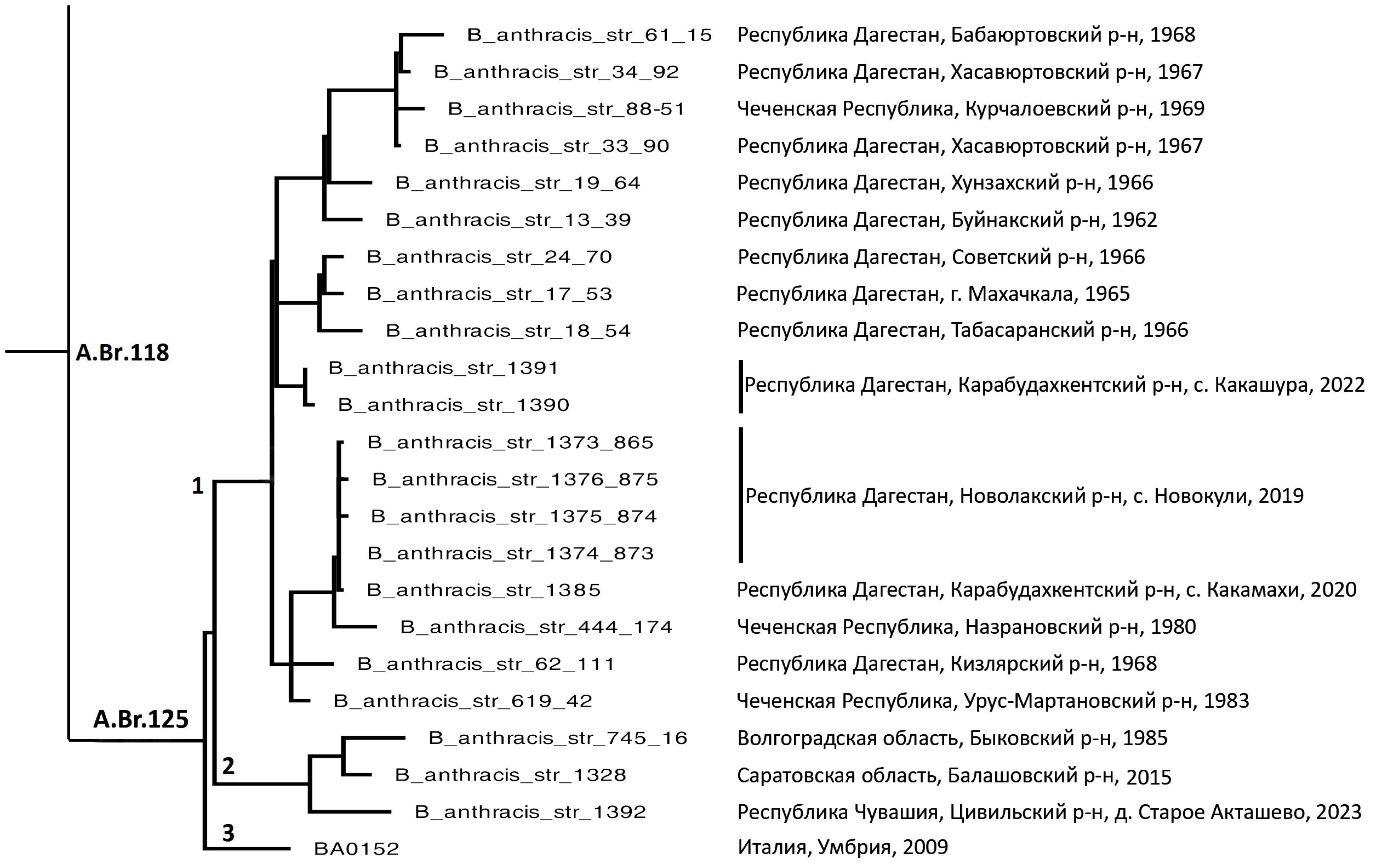 In all cases, the genome structure typical of the B. anthracis species has been established. The phylogenetic relationship of B. anthracis isolates with B. anthracis strains previously isolated in Russia is shown.