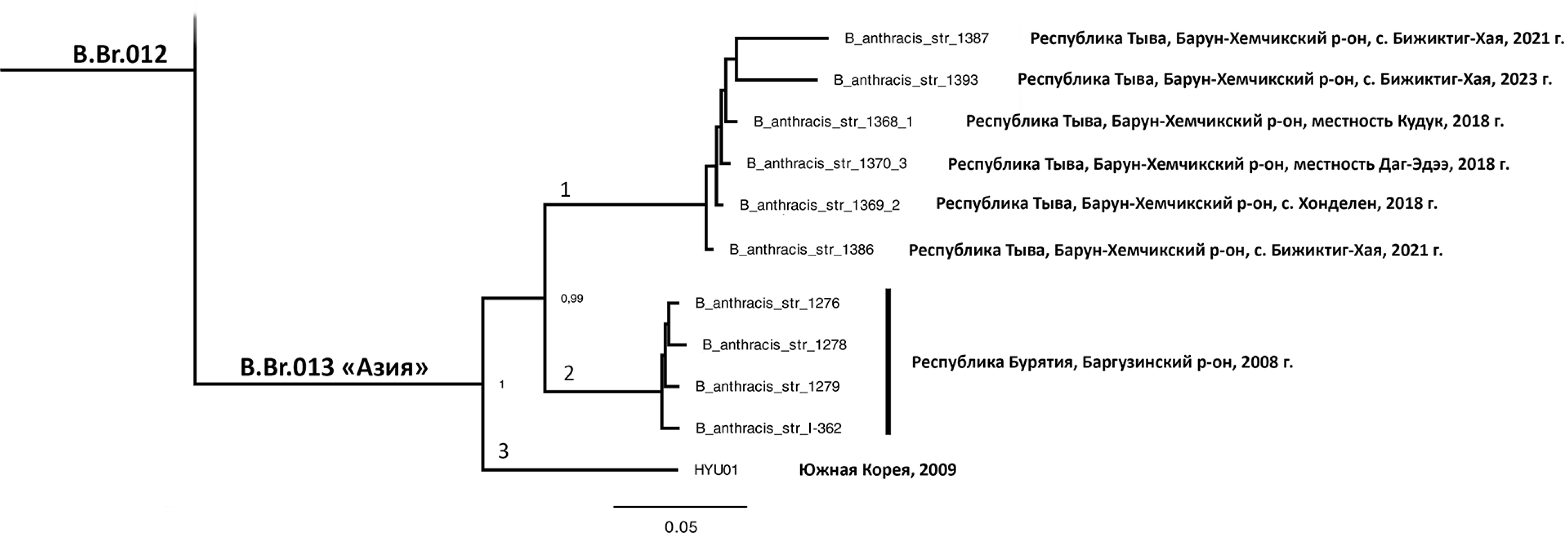 Рис. 3. Филогенетическое положение штаммов B. anthracis, выделенных в Республике Тыва (1) и Республике Бурятия (2). Фрагмент дендрограммы, реконструированной на основе wg-SNP-анализа методом максимального правдоподобия в соответствии с моделью Tamura– Nei.