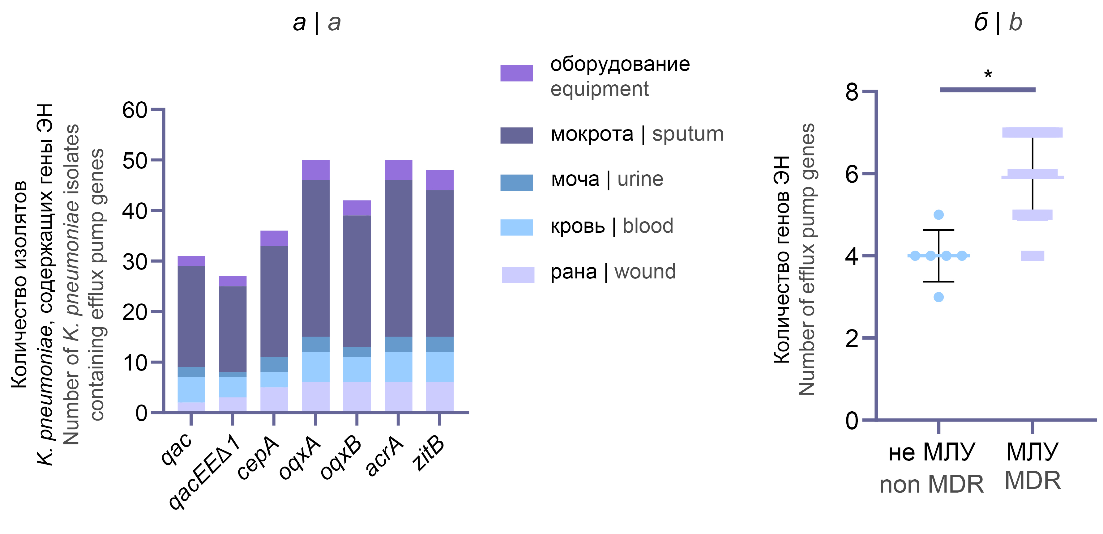 Все протестированные гены ЭН встречались с высокой частотой среди изолятов K. pneumoniae, выделенных из биологического материала пациентов и медицинского оборудования кардиохирургического стационара (рис. 1, а). Распространённость генов qacE, qacEΔ1, oqxB и cepA, ассоциированных с устойчивостью к хлоргексидину и ЧАС, оказалась значительной и составила 62% (31/50), 54% (27/50), 84% (42/50) и 72% (36/50) соответственно. Гены oqxA и acrA были обнаружены у всех изолятов. Встречаемость K. pneumoniae, содержащих ген системы выброса ионов цинка (zitB), составила 96% (48/50). В целом в геномах K. pneumoniae было обнаружено 3–7 генов разных ЭН и транспортёров одновременно, причём в исследуемой выборке более половины культур имели 6 и более ЭН (58%, 29/50). Важно отметить, что изоляты с МЛУ содержали больше разных эффлюксных систем, чем чувствительные K. pneumoniae (p < 0,05, t-тест) (рис. 1, б).