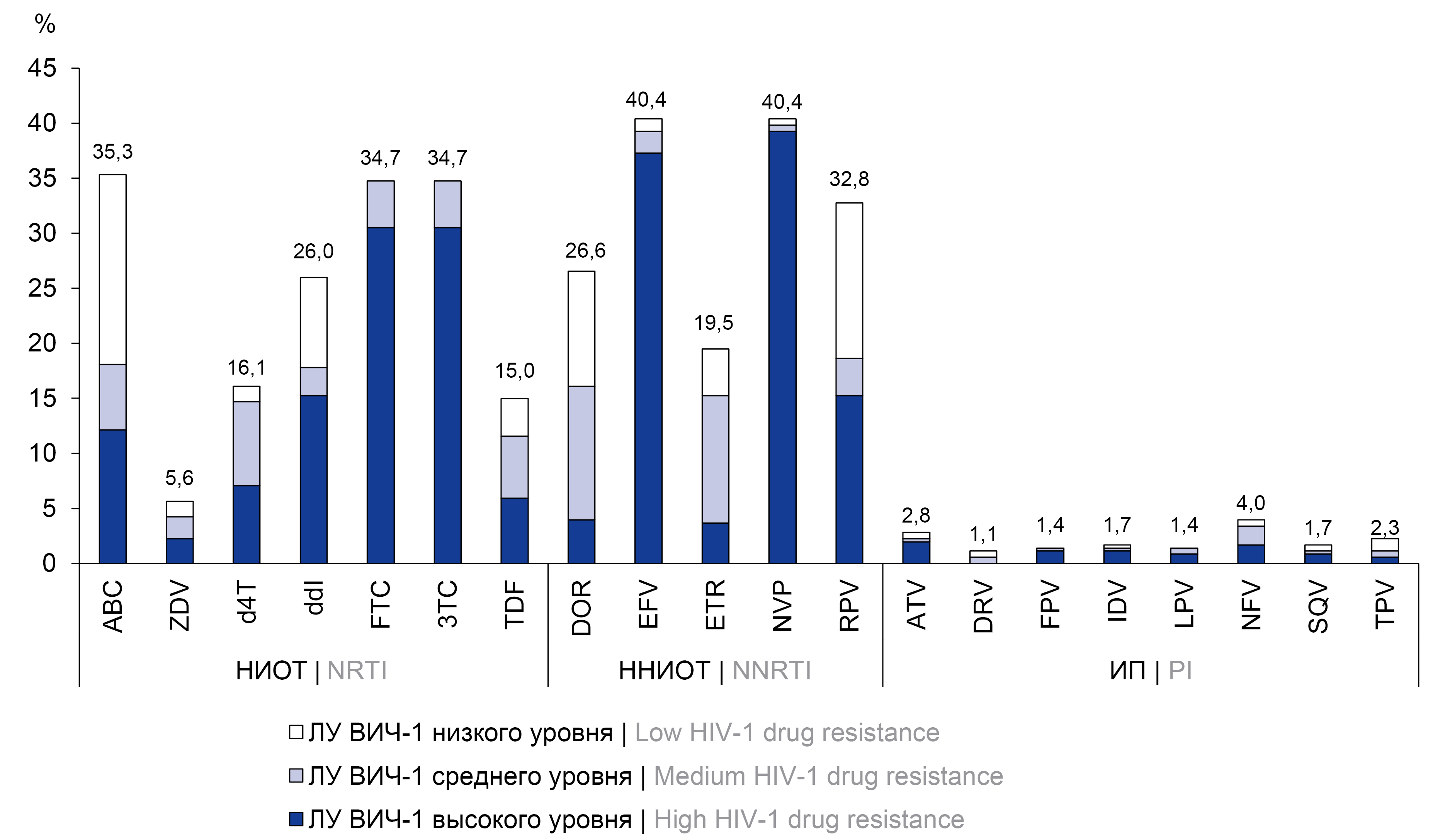 Среди класса ННИОТ ЛУ ВИЧ-1 была обнаружена чаще всего к RPV (7,3%), NVP (6,4%) и EFV (6,1%), причём к препаратам 1-го поколения преимущественно высокого уровня (рис. 2). Среди ИП ЛУ ВИЧ-1 чаще всего была выявлена к NFV (2,6%). Среди препаратов класса НИОТ резистентность ВИЧ-1 была определена наиболее часто к ABC (0,7%), FTC (0,7%) и 3TC (0,7%).