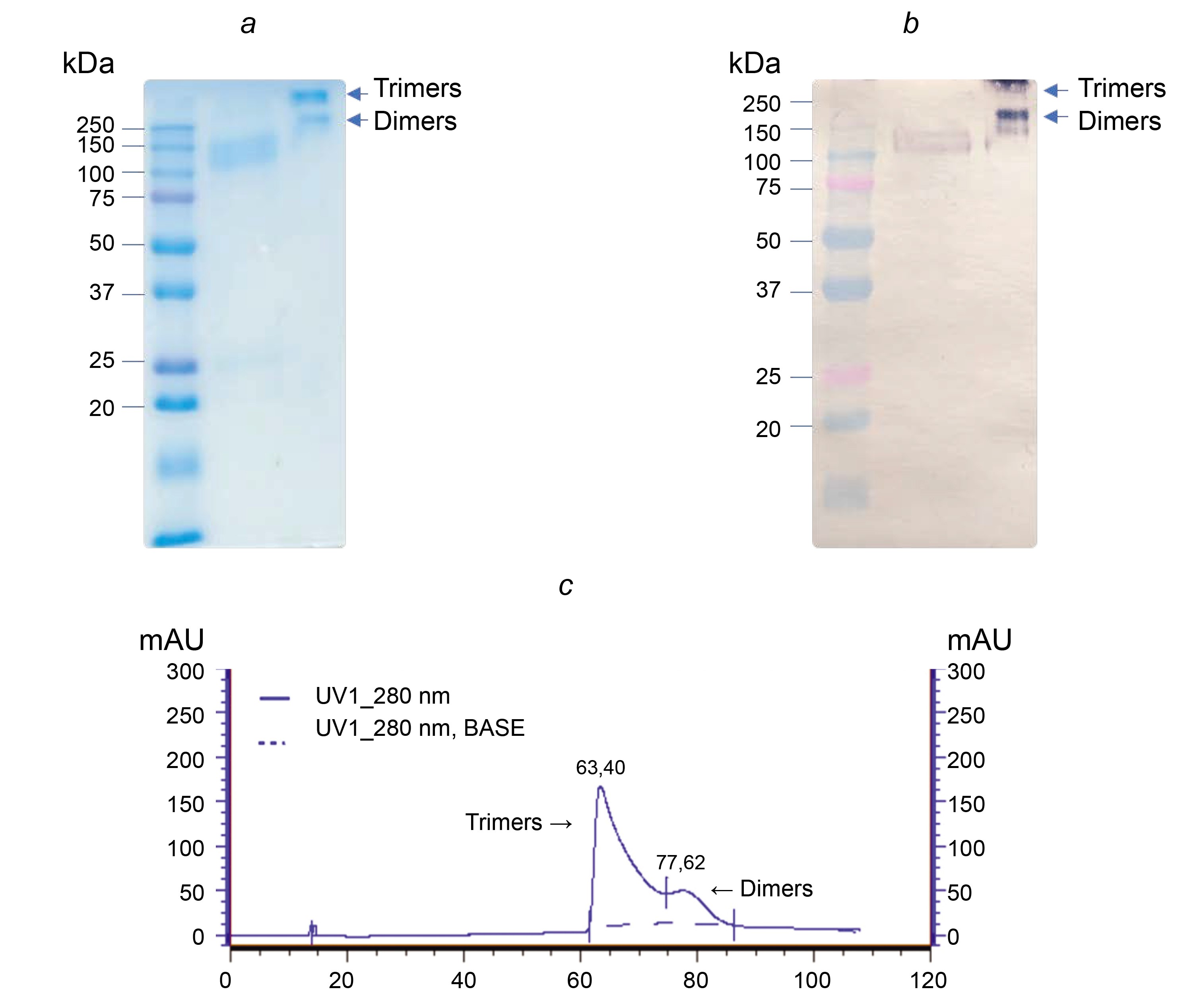 Using gel filtration on a pre-calibrated ChromLinXTM 16/1000 Tiderose GF200 column (Taidu Biotech), it was found that the main peak of the target protein comes out in the region corresponding to the trimeric form (Fig. 4, c).