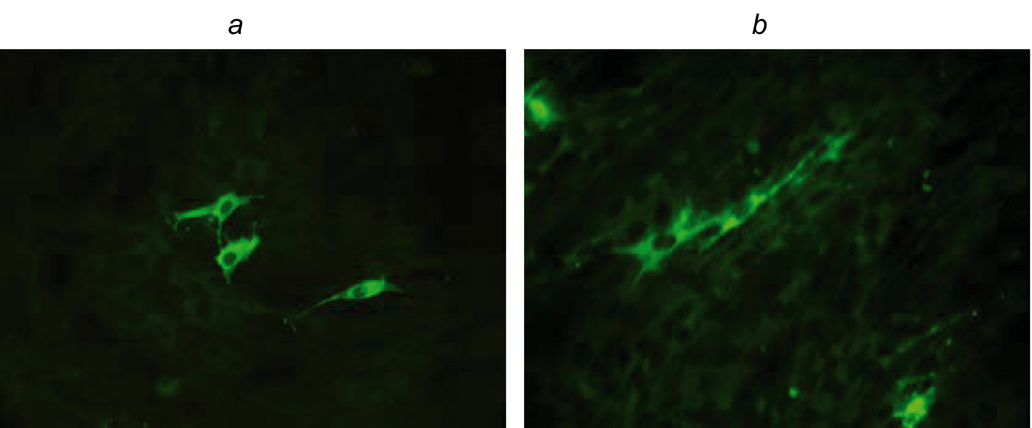 Materials and methods. BHK-21 cells were transfected with the srRNA mixture by electroporation. Recombinant virus-like particles (recVLP’s) in recVLP’s-infected cells were detected using the immunofluorescence assay (ELISA) and electron microscopy. recVLP’s were used to infect glioblastoma cells and normal macrophages from a healthy donor.