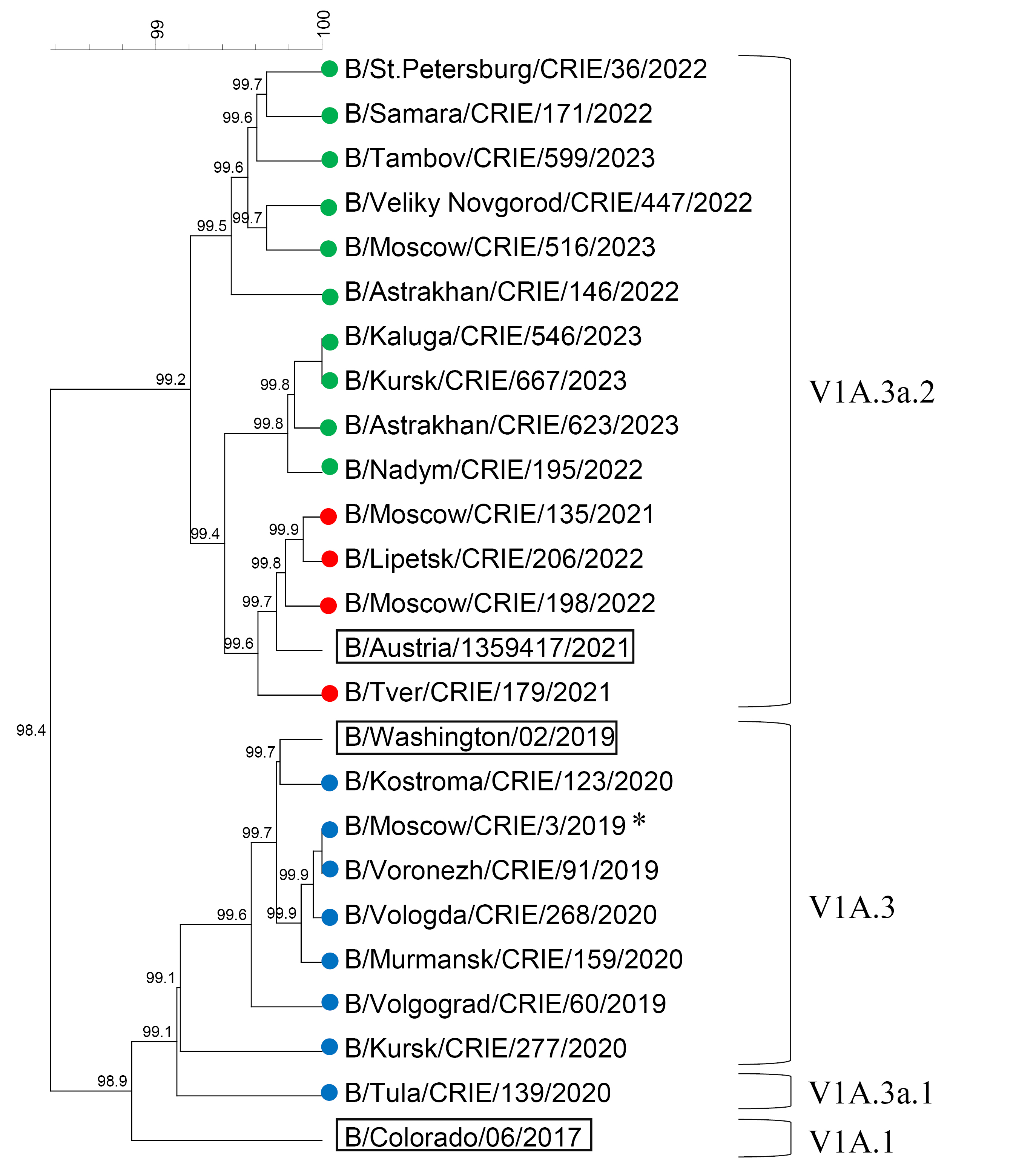 The data we obtained on the distribution of influenza B viruses by genetic groups also corresponded to the data of the Smorodintsev Research Institute of Influenza: in 2019–2020, the absolute majority of sequenced influenza B viruses belonged to the V1A (del162-164) clade of the Victorian lineage (reference virus B/Washington/02/2019)14; in the 2021–2022 season, influenza B/Victoria viruses of the genetic subgroup V1A.3 a.215 were found, in the 2022–2023 season, influenza type B viruses were assigned to genetic subgroup V1A.3a.2 and similar to the reference virus B/Austria/1359417/2021.