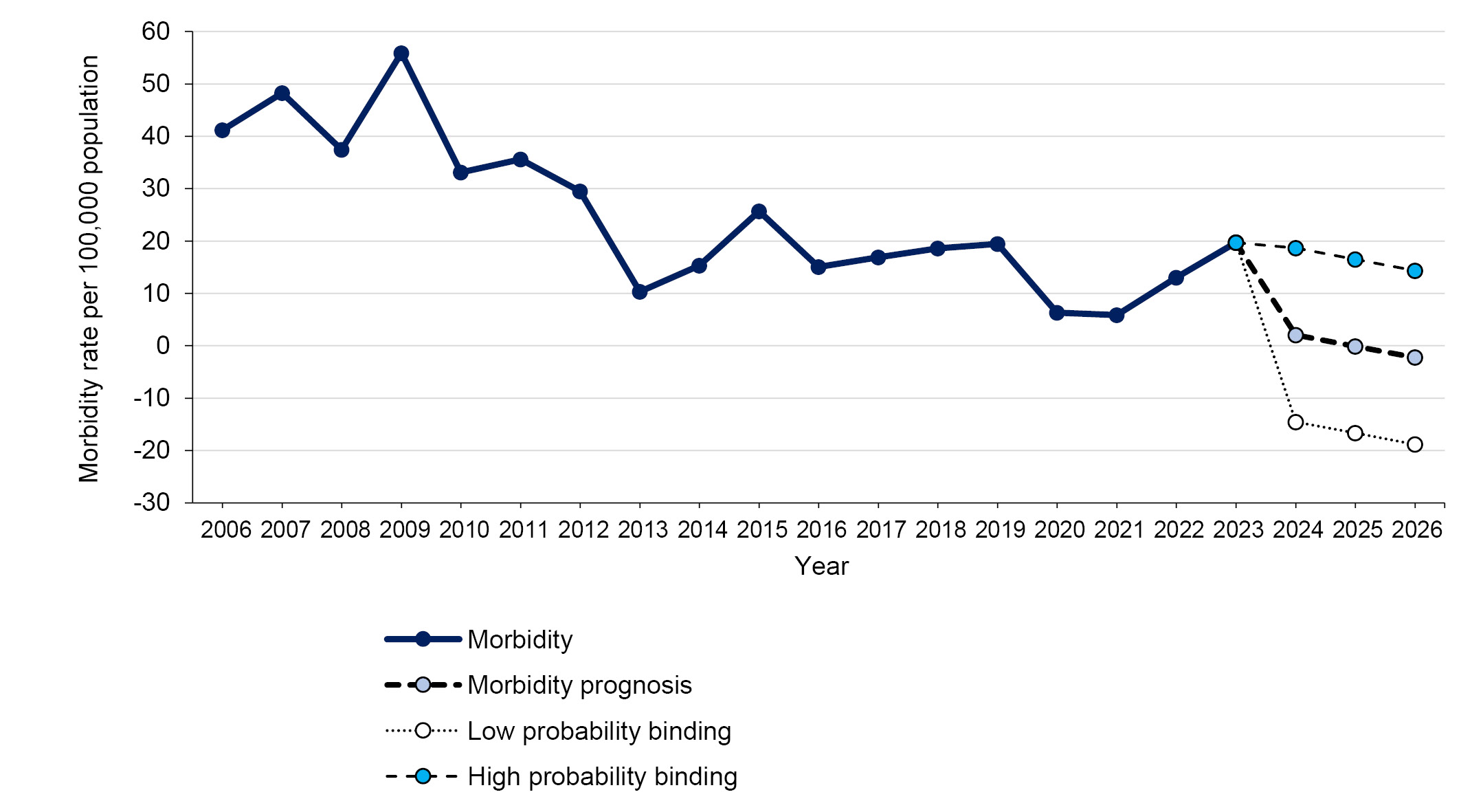 The interval forecast of Lyme disease incidence in the Kirov region for the 2024–2026 period demonstrates a downward trend. The observed decrease in the intensity of manifestations of the epidemic process can be explained by an increase in the volume of acaricide treatments, changes in weather conditions (a tendency to decrease the average annual precipitation). It should be noted that the influence of other factors cannot be excluded.