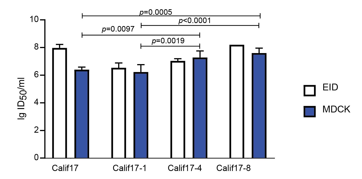 *p < 0.05 compared with TCID50/ml Calif17; †p < 0.05 compared with EID50/ml Calif17.