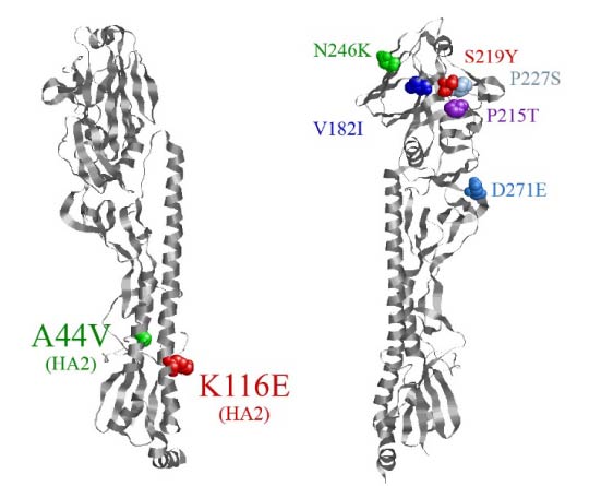 The arrangement of amino acids is shown on the HA monomer A/California/04/2009 (H1N1) (PDBID: 3UYX). Illustrations were obtained using the «RasMol v. 2.7.5» program.