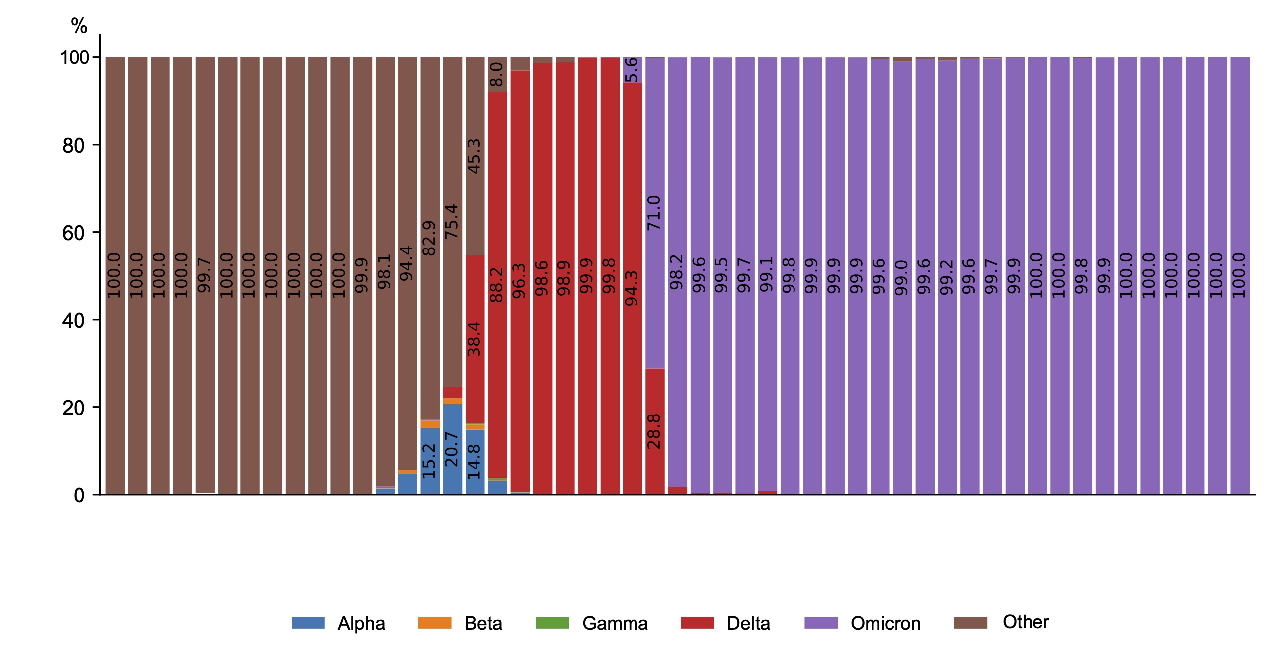 Fig. 1. Dynamics of SARS-CoV-2 genetic variants in Russia in 2020–2024.