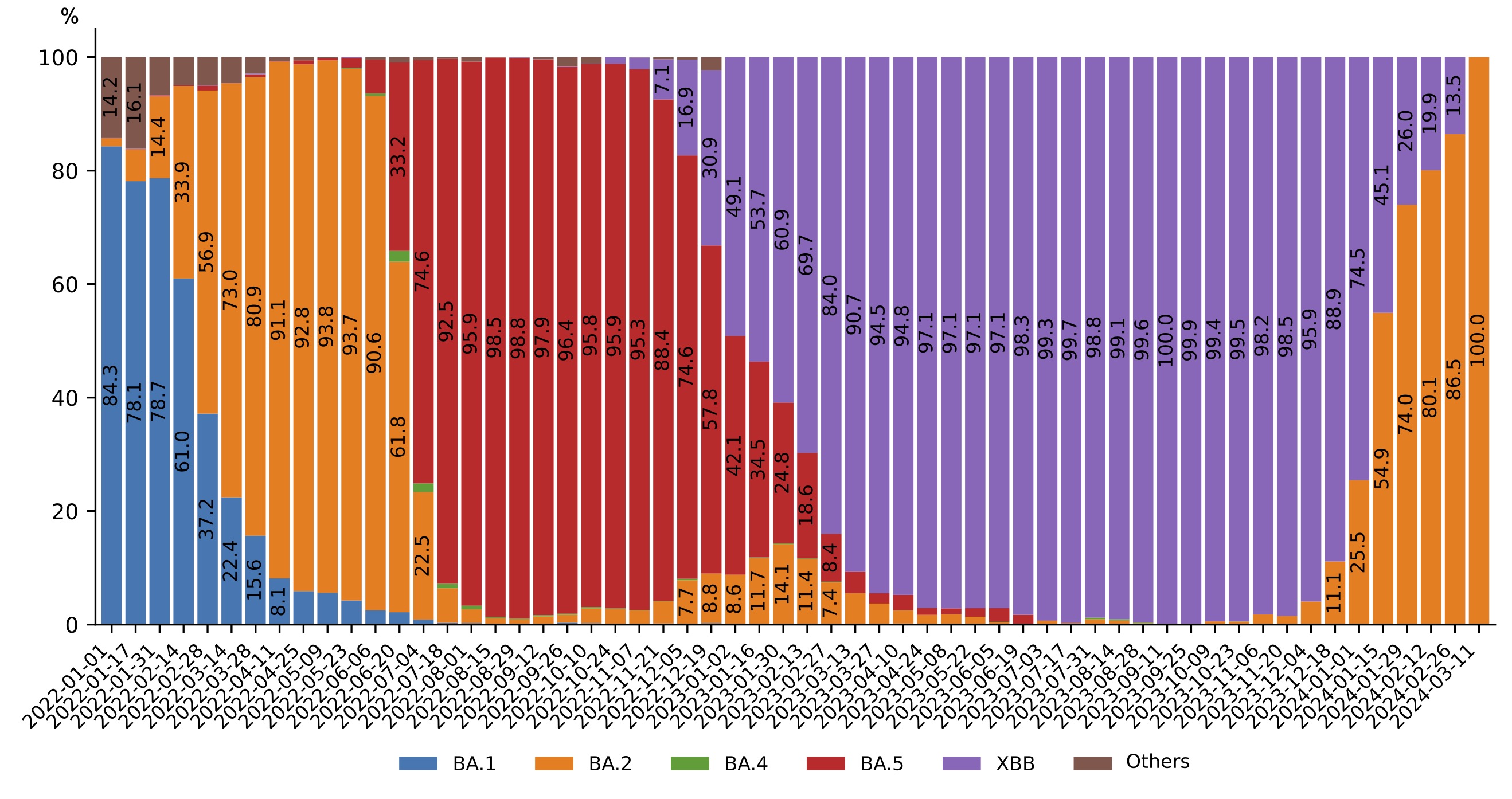Fig. 2. Dynamics of Omicron genetic variant in Russia in 2022–2024.