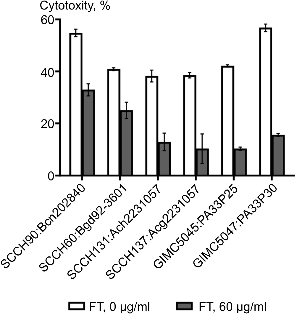 The effect of FT on the cytotoxicity of isolates from CF patients was investigated by selecting the time of contact of bacterial cells with HeLa cells, taking into account the slow growth of such bacteria in culture. While at a contact time of 4 h at doses of 10 and 50 MOI the cytotoxicity of isolates was 16–26 and 27–43%, respectively, after 20 h of contact the toxicity rose to 70-100%. A dose of 5 MOI and a contact time of 18 h were determined as optimal for studying the effect of FT. Under the influence of FT there was a decrease in cytotoxicity for all isolates: for P. aeruginosa isolates — by 3.6 and 4.0 times, for B. cepacia — by 2.6, for B. gladioli — by 3.2, for A. xylosoxidans — by 3.0, for A. ruhlandii — by 3.7 (Fig. 1).