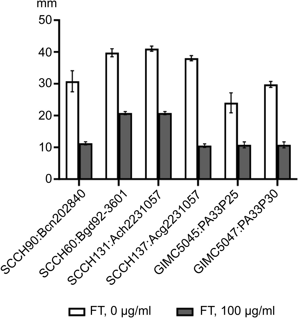 Comparison of the swimming mobility of isolates showed a significant reduction of the bacterial movement zone under the influence of FT: for P. aeruginosa — 2.2 and 2.8 times, for B. cepacia — 2.7 times, for B. gladioli — 2.0 times, for A. xylosoxidans — 2.0 times, for A. ruhlandii — 3.6 times (Fig. 2). The mobility of P. aeruginosa isolates in the control was lower than other bacteria, however, the difference with samples incubated with FT was statistically significant (p < 0.05).