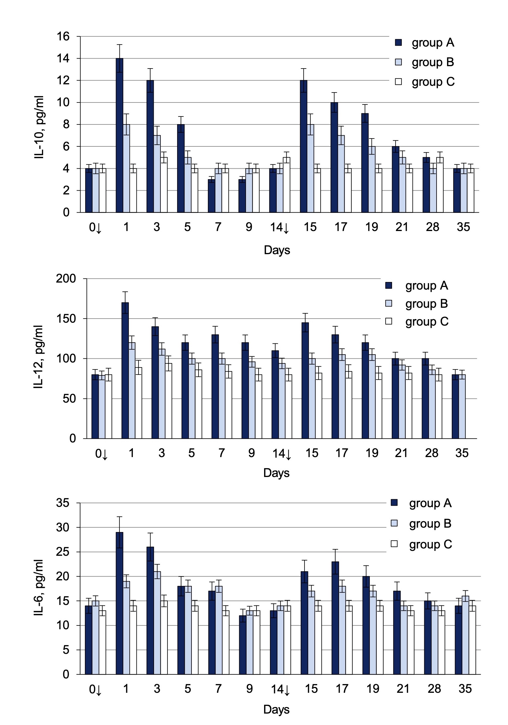 The maximum rise in the concentration of IL-6, IL-10 and IL-12 in the blood serum of mice was observed on the 1st day after the 1st immunization (Fig. 2). IL-10 concentration increased almost 4-fold relative to the initial level (p < 0.0001), i.e. to a greater extent than IL-6 and IL-12 concentrations, which increased almost 2-fold (p < 0.001). The concentration of IL-10, IL-12 and IL-6 in group A animals vaccinated with 40 µg dose was significantly higher than in group B animals vaccinated with 10 µg dose both after the 1st and after the 2nd immunization (p < 0.001 for IL-10, IL-12 and p < 0.005 for IL-6).