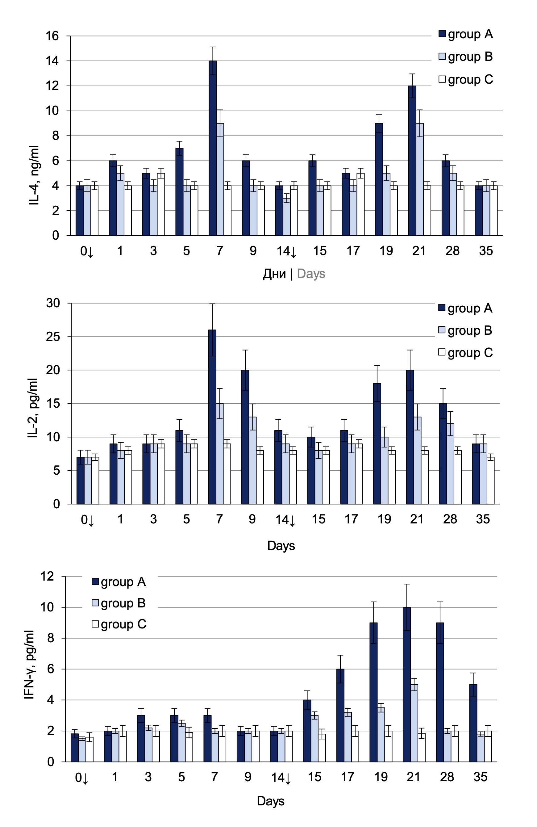 IFN-γ production by group A animal splenocytes was significantly higher than in group B at all observation periods (p < 0.05–0.005). In animals of group A, the increased production of IFN-γ by splenocytes persisted up to 35 days of observation. The dose-dependent effect of IFN-γ production by splenocytes of immune animals was demonstrated.