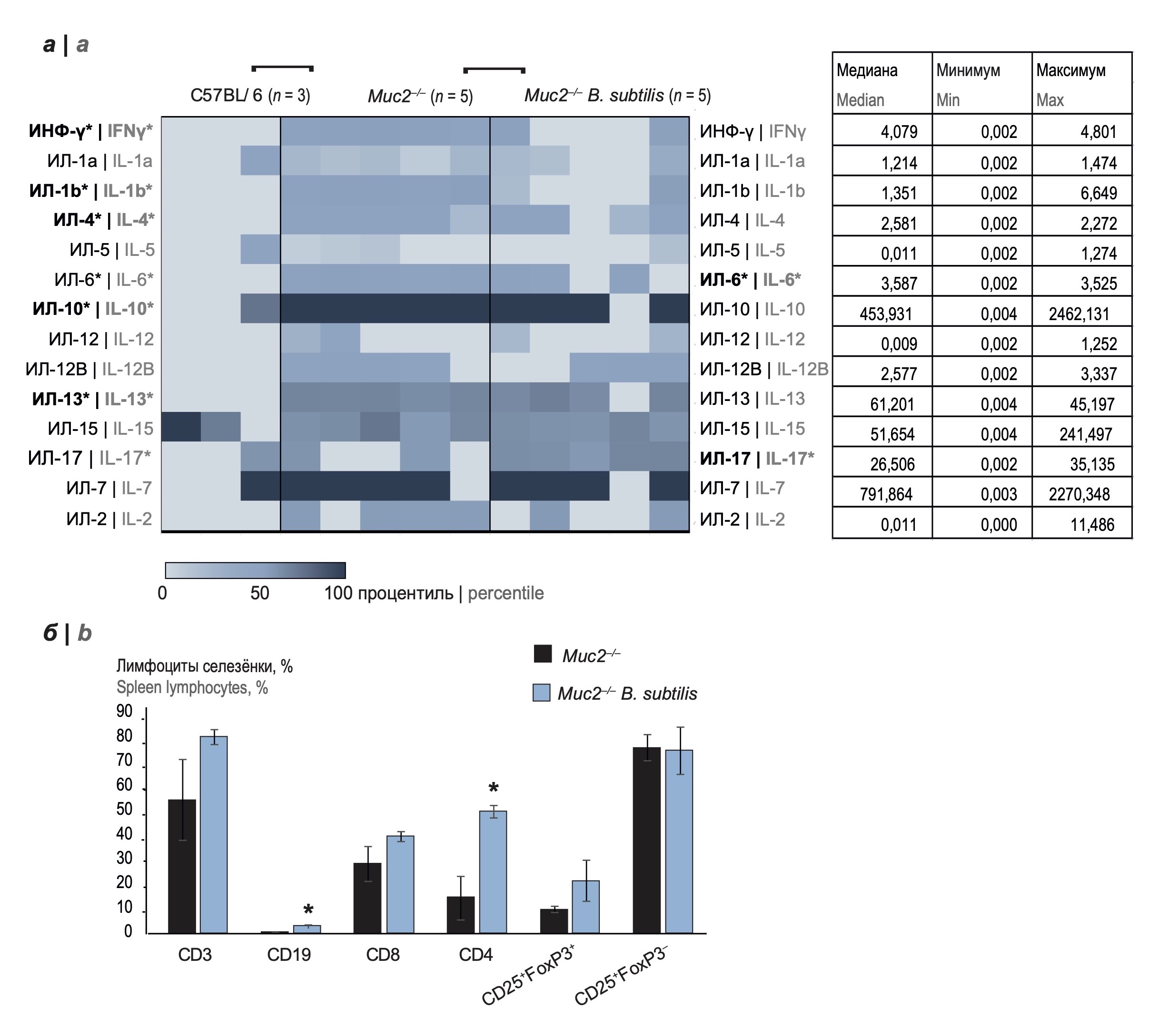 В результате добавления в корм спор B. subtilis BS20 у Muc2–/– отмечено достоверно значимое увеличение доли B-клеток (CD45+CD19+) и Т-хелперов (CD45+CD3+CD4+); р < 0,05 (рис. 2, б). Статистически значимых различий в количестве других лимфоцитов: Т-клетки (СD45+CD3+), T-киллеры (СD45+CD3+CD8+), регуляторные (СD45+CD3+CD4+CD25+FoxP3+) и эффекторные (СD45+CD3+CD4+CD25+FoxP3–) Т-клетки после кормления спорами бактерий не выявлено.