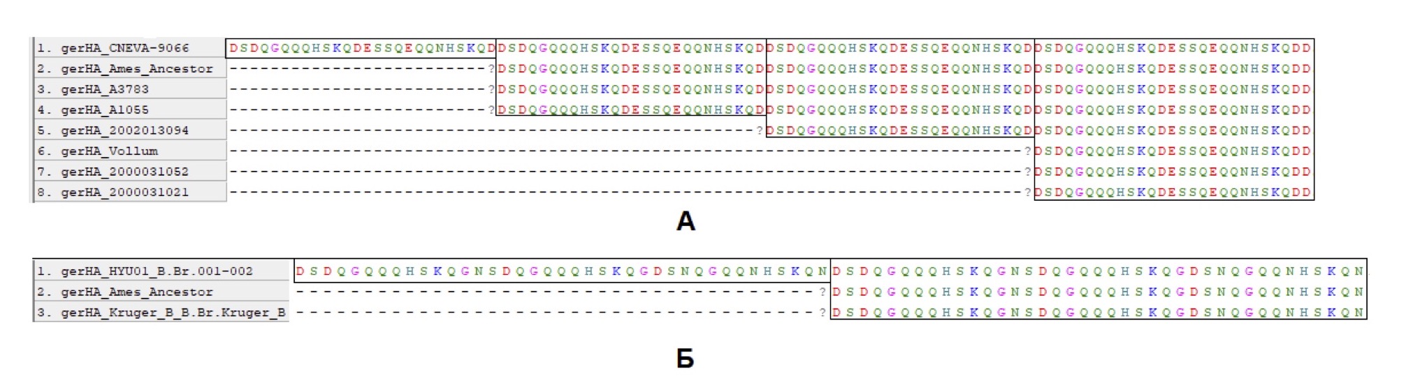 VNTR с единицей повтора размером 117 п.н. отмечен у штамма HYU01 (canSNP группа B.Br.001/002) в области 275–508 п.н. (2 повтора), у штаммов Kruger B (canSNP группа B.Br.Kruger B) и Ames Ancestor — одна единица такого размера. Соответствующие белки GerHA имели 2 повтора и 1 единицу повтора DSDQGQQQHSKQGNSDQGQQQHSKQGDSQGQQNHSKQN (рис. 1, б).
