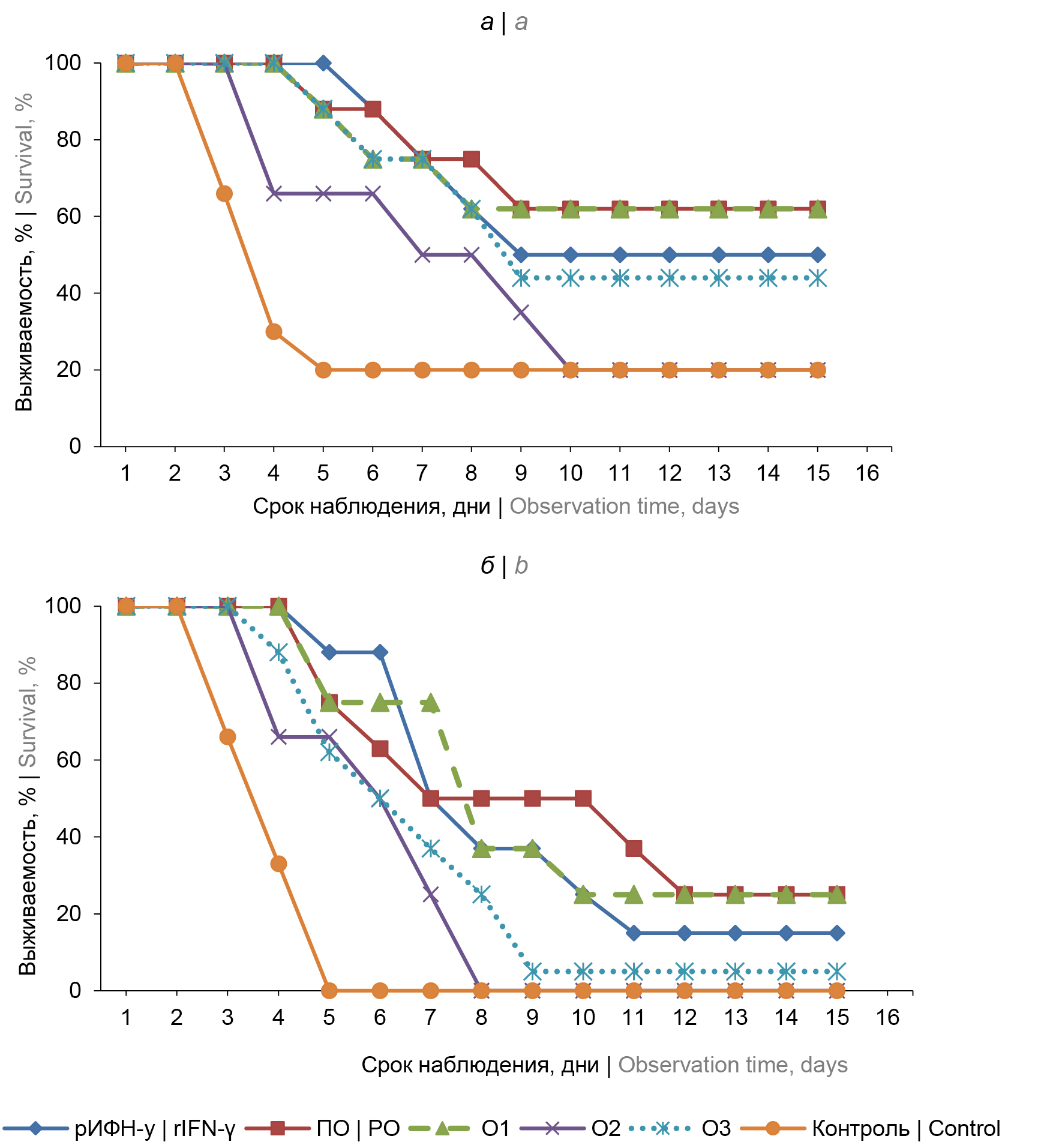 Во всех опытных группах отмечено увеличение средней продолжительности жизни павших животных, в большей степени у мышей, иммунизированных рИФН-γ, ПО и О3, на 24–96 ч в зависимости от типа биомодели и инфицирующей дозы вирулентного штамма (табл. 2). При применении рИФН-γ, ПО и О1 зарегистрировано пролонгирование инкубационного периода до начала заболевания у павших животных в среднем на 24–48 ч.