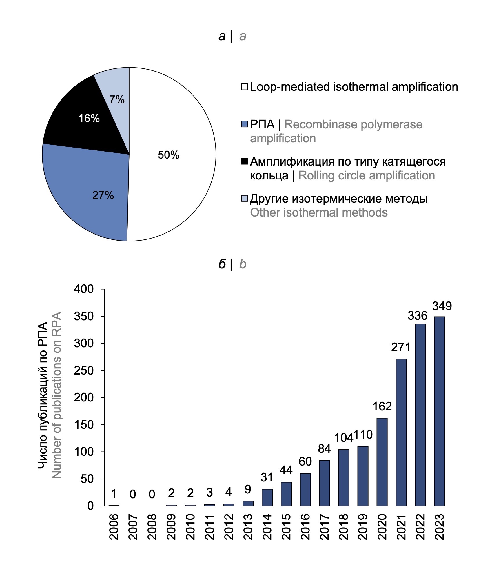 Анализ числа публикаций в базе данных PubMed, посвящённых методам изотермической амплификации, за последние 3 года показал, что наиболее популярным методом является петлевая изотермическая амплификация (Loop-mediated isothermal amplification; LAMP), использованию которой посвящено около половины статей, на втором месте — рекомбиназная полимеразная амплификация (РПА; 27% статей), затем амплификация по типу катящегося кольца — 16% публикаций, остальные изотермические методы в совокупности заняли менее 7% от общего числа публикаций (рис. 1, а).