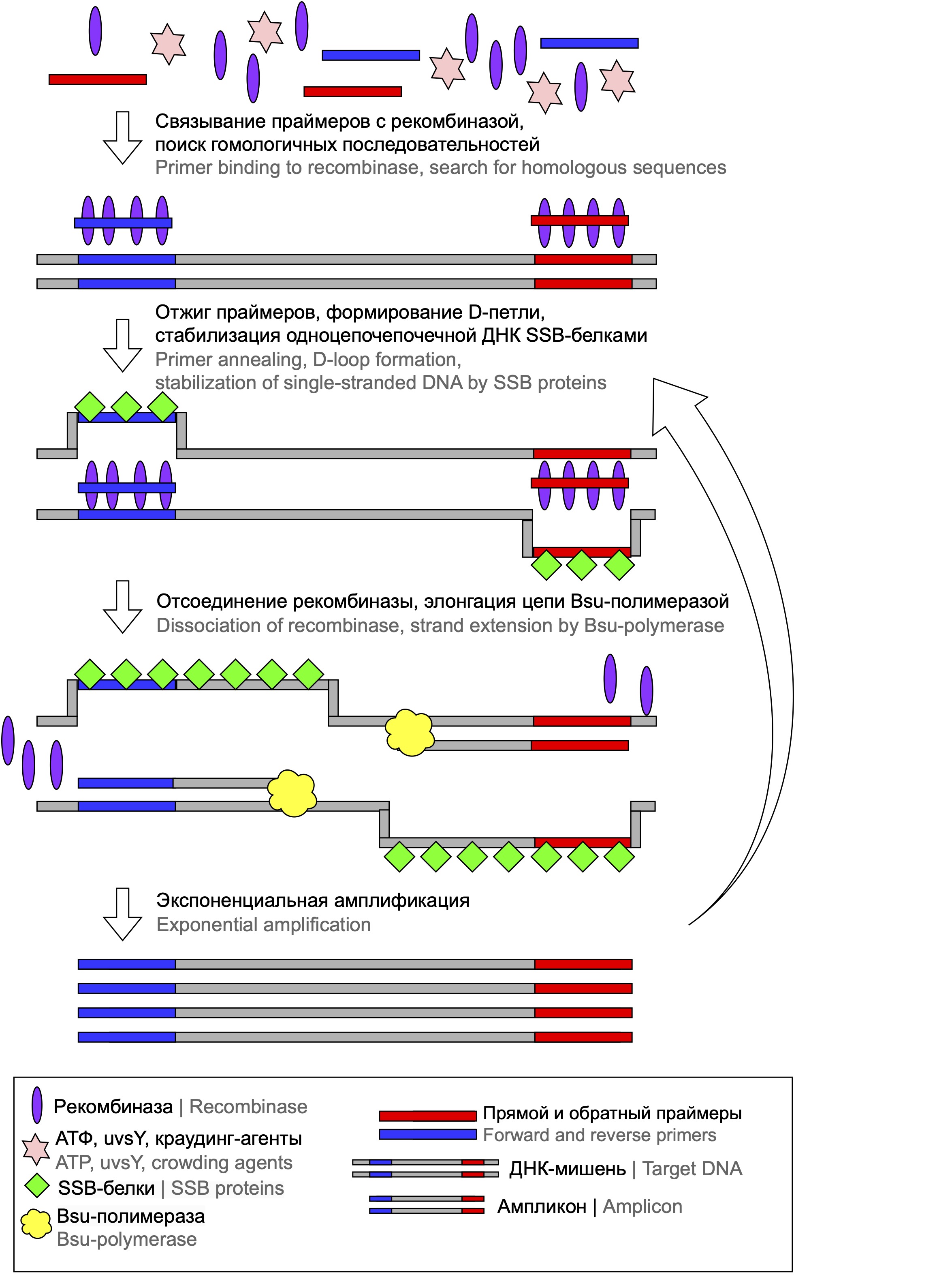 Реакция РПА начинается с присоединения рекомбиназы к праймерам посредством белка T4 UvsY. Сформировавшийся нуклеопротеиновый комплекс при сближении с гомологичной последовательностью двухцепочечной ДНК расплетает её, способствуя отжигу праймера. При этом образуется D-петля. Раскрученные одноцепочечные нити стабилизируют SSB белки T4 gp32. После отсоединения рекомбиназы происходят посадка Bsu-полимеразы (или Sau-полимеразы) и элонгация целевой мишени с вытеснением комплементарной цепи. В результате образуются два дуплекса, которые выступают в качестве матрицы при экспоненциальной амплификации. Фактор краудинга (высокомолекулярный полиэтиленгликоль, PEG 35K) способствует имитации условий in vivo и катализирует работу ферментов. Дитиотреитол стабилизирует работу ферментов; фосфокреатинин, креатинкиназа и аденозинтрифосфат обеспечивают систему энергией. Дезоксирибонуклеозидтрифосфаты используются для синтеза ампликонов. Для поддержания необходимого pH применяют буфер, содержащий трис и другие соли. Ацетат магния выступает в роли кофактора ферментов и инициирует РПА [2].