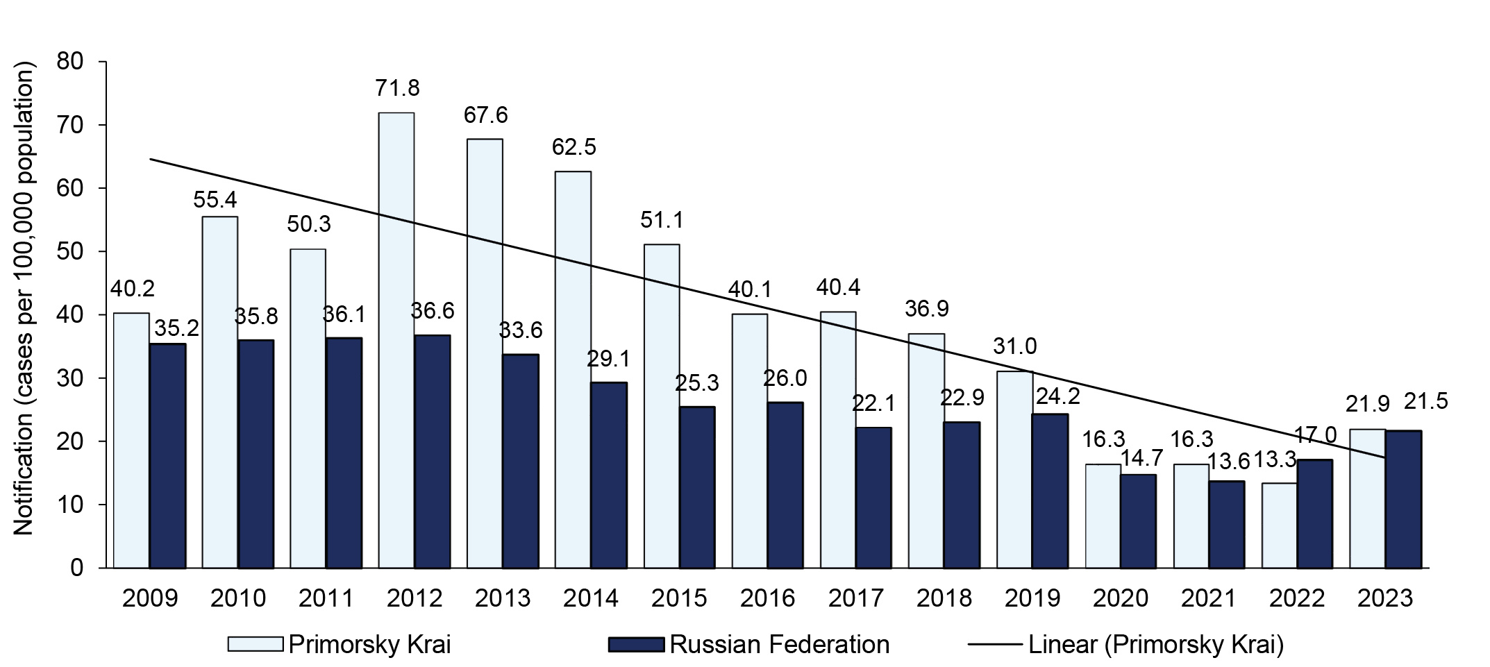 The period from 2009 to 2012 in the Primorsky Krai was characterized by an increase in the incidence of salmonellosis, with a peak registered in 2012 at 71.8 per 100,000 population. In the following years, a trend towards a decrease in morbidity was observed, and by 2022, its level had dropped to 13.3 per 100,000 population (the growth rate was –4.2), whereas in Russia, the incidence of salmonellosis was more stable (the growth rate was –3.4). At the same time, the incidence rates in Primorsky Krai exceeded the national data from 2009 to 2019, and starting from 2020, they almost leveled off (Fig. 1). In 2023, an increase in morbidity was observed both in Primorsky Krai and in Russia as a whole (up to 21.6 per 100,000 population).