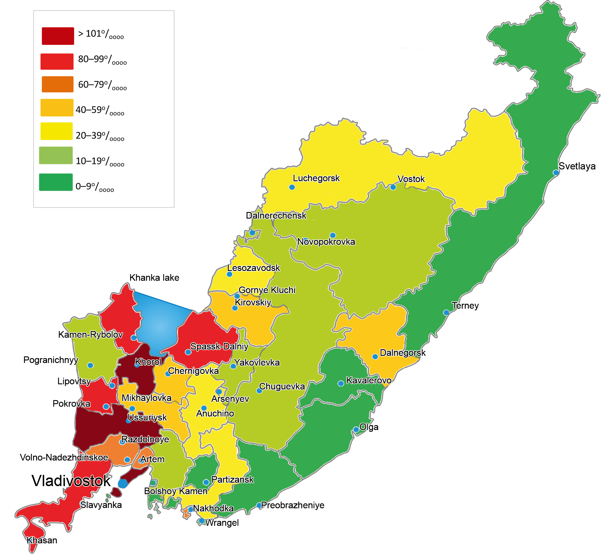 Before and during the COVID-19 pandemic, the lowest incidence of salmonellosis infections in the Primorsky Krai region was recorded in the municipal districts of Terneisky, Kavalerovsky, Lazovsky, Olginsky, Partizansky, and the city of Fokino (Fig. 2). It should be noted that during the peak of the pandemic, S. enterica strains were not isolated in these areas.